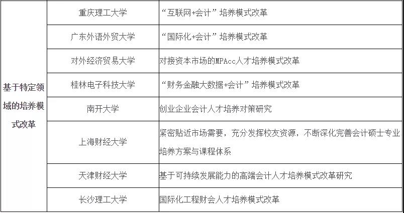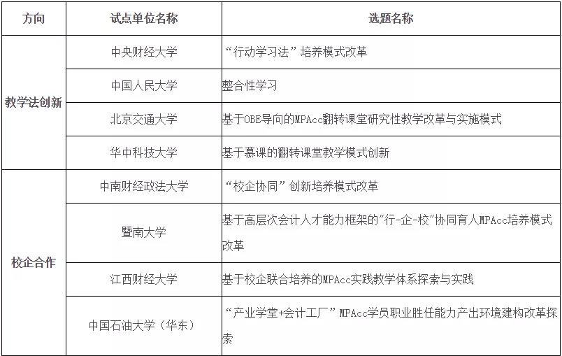 會計教指委邀請了16家培養(yǎng)單位參與深化綜合改革試點(diǎn)工作,改革試點(diǎn)方向包括教學(xué)法創(chuàng)新、校企合作以及基于特定領(lǐng)域的培養(yǎng)模式改革: