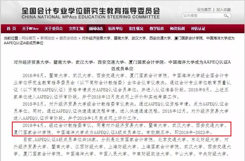 導(dǎo)讀:2019年全國MPAcc教學(xué)管理工作會議宣布了全國會計碩士專業(yè)學(xué)位教育質(zhì)量認證(AAPEQ認證)結(jié)果,暨南大學(xué)、對外經(jīng)貿(mào)大學(xué)、廈門國家會計學(xué)院、西安交通大學(xué)、武漢大學(xué)和中國海洋大學(xué)6所高校成為AAPEQ認證A級成員單位,有效期5年。