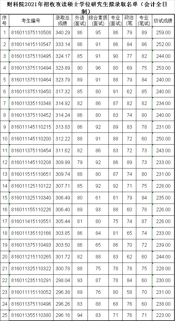 全日制 非全日制 財科院研究生院(副司級單位)專門從事研究生教育管理工作。為我國政府機構(gòu)、企事業(yè)單位及科研教學(xué)單位培養(yǎng)了大量的財政、會計、國民經(jīng)濟管理、企業(yè)管理等高端專業(yè)人才。被業(yè)內(nèi)人士稱為財政界的“黃埔軍校”。 2021年MPAcc專業(yè)招生信息 中國財政科學(xué)研究院2021年MPAcc專業(yè)計劃招收全日制32人,非全日制42人,學(xué)制2年。 2021年專業(yè)復(fù)試基本分數(shù)線為:218/92/46。 2021年MPAcc專業(yè)擬錄取名單 中國財政科學(xué)研究院2021年MPAcc專業(yè)全日制進入復(fù)試55人,一志愿擬錄取25人。 非全日制一支志愿進入復(fù)試7人,擬錄取5人。 2021年專業(yè)非全日制調(diào)劑只招收院內(nèi)調(diào)劑,可由高分專業(yè)調(diào)劑到低分專業(yè)。 全日制 非全日制 復(fù)試內(nèi)容