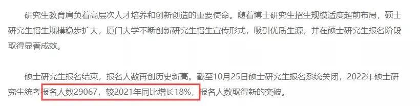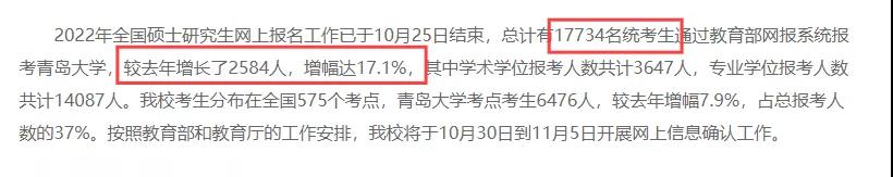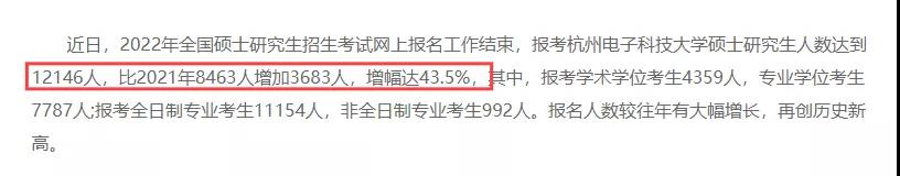 新公布報考人數的院校▼ 今年青島大學共有17734名統考生,較去年增長了2584人,增幅達17.1%。 其中學術學位報考人數共計3647人,專業學位報考人數共計14087人。 杭州電子科技大學 報考杭州電子科技大學碩士研究生人數達到12146人,比2021年的8463人增加3683人,增幅達43.5%。 其中報考學術學位考生4359人,專業學位考生7787人;報考全日制專業考生11154人,非全日制專業考生992人。報名人數較往年有大幅增長,再創歷史新高。 截止10月19日,報考該校2022全國碩士研究生考生達到13275人,比上年增加24.9%,報名人數還在持續增加。