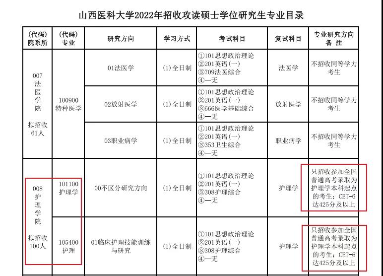 山西醫科大學今年發布的招生專業目錄中明確要求護理學(101100)專業只招收CET-6達425分及以上的同學