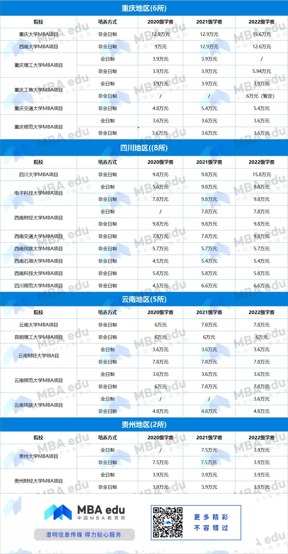 從上述匯總數(shù)據(jù)可以看到,學(xué)費(fèi)雖有所上調(diào),但幅度不大,價格相對親民。西南地區(qū)的MBA辦學(xué)實力也是不容小覷,共有10所211院校以及3所985院校(四川大學(xué)、重慶大學(xué)、電子科技大學(xué))。