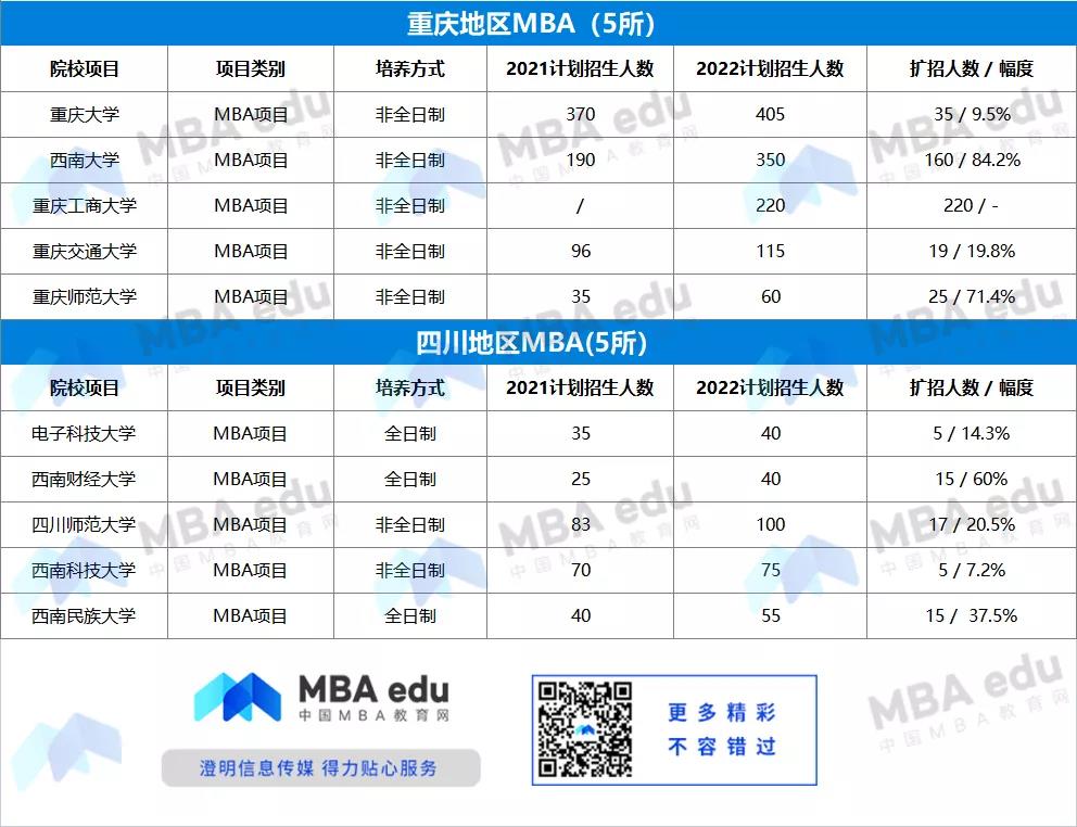 2022年西南地區(qū)MBA招生院校:重慶6所、四川8所、云南5所、貴州2所,共計21所、30+項目類別。 目前西南地區(qū)MBA學(xué)費(fèi)漲勢已定的院校共計 4 所,其中重慶 2 所、四川 2 所,學(xué)費(fèi)漲幅不太。 學(xué)費(fèi)方面:四川大學(xué)非全日制MBA學(xué)費(fèi)上漲6萬,漲幅61.2%;重慶理工大學(xué)非全日制MBA上漲2.04萬元,52.3%;西南交通大學(xué)非全日制MBA學(xué)費(fèi)上漲2萬元,漲幅25.6%。重慶大學(xué)非全日制MBA學(xué)費(fèi)上漲2.7萬元,漲幅20.9%。 2所高校新增MBA項目: 重慶工商大學(xué)增設(shè)非全日制MBA,學(xué)費(fèi)6萬元/生;云南民族大學(xué)增設(shè)全日制MBA,學(xué)費(fèi)3.6萬元/生。