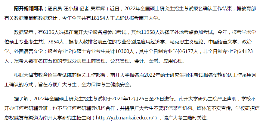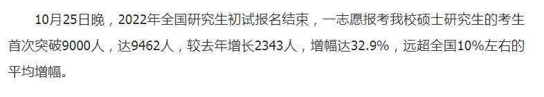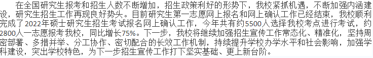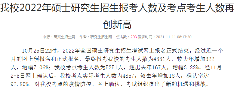 目前有以下11個報考點公布了今年考研網上確認數據,一起來看看吧! 11月2日至4日,我校順利完成了2022年碩士研究生招生考試報名網上確認工作。今年共有約8500人選擇我校報考點進行報名,經過對每一位報考者報考信息與報考條件的細致核查,共有近7700人通過我校報考點網上確認審核。 11月1日—5日, 2022年全國碩士研究生招生考試中國科學技術大學報考點網上確認工作順利完成,共有3000余名考生完成網上確認。 2022年碩士研究生招生考試中國農業大學考點網上確認工作于11月2—5日在我校西校區順利進行。今年我校碩士研究生報考人數達1.3萬人,其中全日制10768人,比去年增長了38%。 我校考點共有3721名考生進行了網上確認,經過四天緊張有序的信息核對和資格審核,共有3240名考生符合我校報考點要求,順利完成網上確認,比去年增長了17%。 今年共有2998人選擇我校報考點進行報名。經過對每一位報考者報考信息與報考條件的細致核查,共有2828人通過確認審核,較去年增加308人,增幅達12.2%。 11月5日,我校報考點2022年碩士研究生招生考試網上確認工作順利結束。據統計,此次在我校報考點完成網上確認的考生人數為5030人,同比增長10.6%。 11月2日至11月5日,成都大學報考點(5129)順利完成2022年全國碩士研究生招生考試報考信息網上確認工作,確認率達99.06%。 2022年一志愿報考我校碩士研究生的各專業人數分布如下,供廣大考生及各招生學院參考。 今年全國共有18154人正式確認報考南開大學。數據顯示,有6196人選擇在南開大學報名點參加考試,其他11958人選擇了外地考點參加考試。 報考山西中醫藥大學的考生人數為4881人,較去年增加322人,增幅7.06% 一志愿報考我校碩士研究生的考生首次突破9000人,達9462人,較去年增長2343人,增幅達32.9% 今年共有約5500人選擇陜西理工大學考點進行考試,約2800人一志愿報考此院校,同比增長75%。