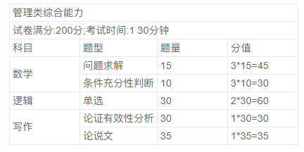 管理類綜合能力考試科目分為數學、邏輯、寫作,具體試卷結構如下: