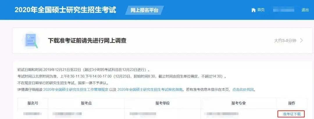 第一步,進入研招網(wǎng)報平臺首頁后,如招生單位已上傳準(zhǔn)考證,你將看到下載鏈接(下圖右下角紅框)。