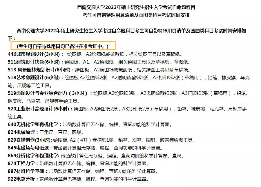 西南交通大學11月19日發布了《西南交通大學2022年碩士研究生招生入學考試自命題科目,考生可自帶特殊用具清單及畫圖類科目考試時間安排》。