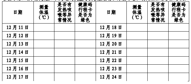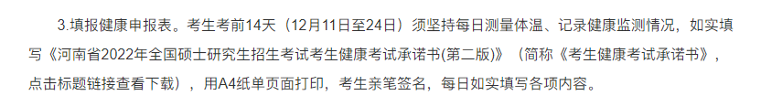 考生考前14天(12月11日至24日)須堅持每日測量體溫、記錄健康監測情況,如實填寫《河南省2022年全國碩士研究生招生考試考生健康考試承諾書(第二版)》(簡稱《考生健康考試承諾書》,點擊標題鏈接查看下載),用A4紙單頁面打印,考生親筆簽名,每日如實填寫各項內容。