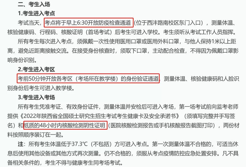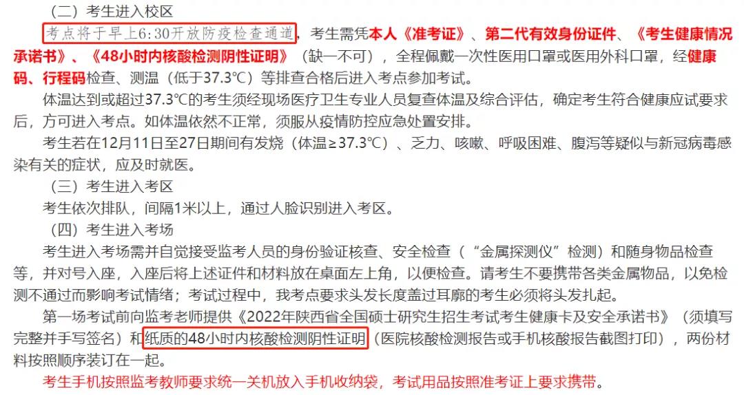 考點將于早上6:30開放防疫檢查通道,第一場考試前向監考老師提供《2022年陜西省全國碩士研究生招生考試考生健康卡及安全承諾書》(須填寫完整并手寫簽名)和紙質的48小時內核酸檢測陰性證明(醫院核酸檢測報告或手機核酸報告截圖打印),兩份材料按照順序裝訂在一起。