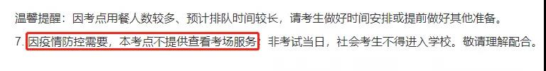 因疫情防控需要,本考點不提供查看考場服務;非考試當日,社會考生不得進入學校。敬請理解配合。