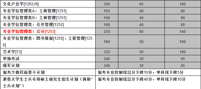 根據2017年碩士研究生入學考試考生成績統計結果和中南大學各院系招生計劃,經中南大學研究生招生工作領導小組討論決定,對入圍復試的考生初試分數基本要求如下(報考全日制及非全日制考生執行以下同一分數要求)。其中,會計碩士分數線為235/60/140.