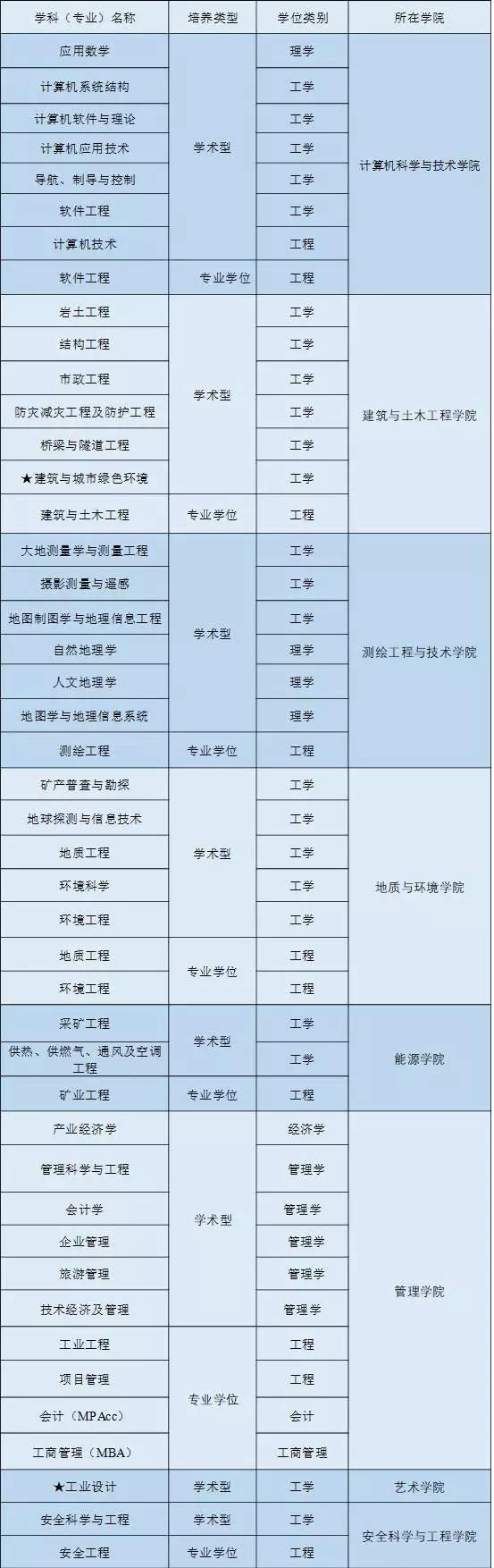 學校學位與研究生教育授權學科覆蓋了工學、理學、管理學、法學、經濟學等5個學科門類,形成了以地礦及其相關學科為特色,以工科為主體,多學科協調發展的學科布局。學校現有研究生導師600余人,博士生導師近80人。目前在校各類研究生4000余人。