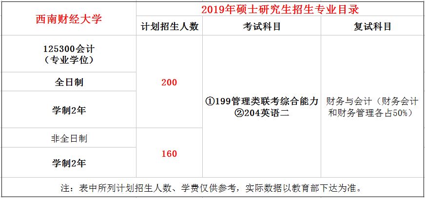 導(dǎo)讀:西南財(cái)經(jīng)大學(xué)2019年MPAcc全日制招收200人,非全日制招收160人,學(xué)制2年。