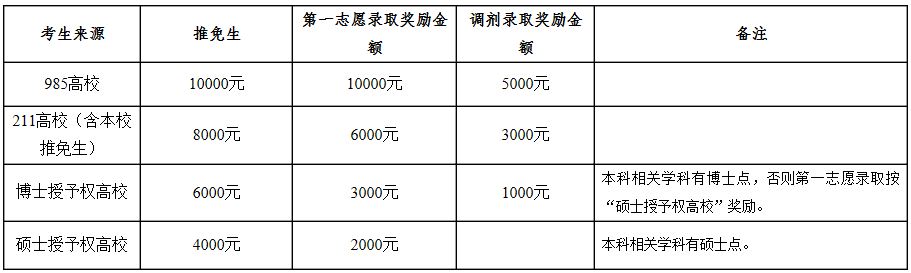 (1)生源獎學金:從2014年起,對達到國家復(fù)試分數(shù)要求并被我校錄取的非定向碩士研究生給予一次性入學獎勵。獎勵標準如下: