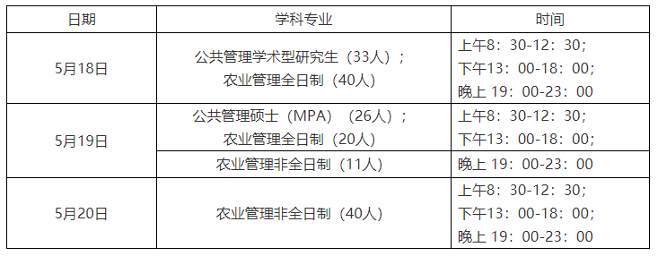 (2)專業基礎知識測試:開放性考試,以口頭回答的方式進行;評價方式為定性評價,分“合格”、“不合格”兩個等級,不合格者不予錄取。公共管理學碩復試科目是管理學原理,參考書目是《管理學:原理與方法》(第五版),周三多等主編,復旦大學出版社,2009年出版;公共管理專碩復試科目思想政治理論(參考書目參照教育部考試大綱)和管理學原理(參考書目《管理學:原理與方法》(第五版),周三多等主編,復旦大學出版社,2009年出版);農業管理專碩復試科目是公共管理學(二),參考書目是《公共行政學》(第四版),張國慶主編,北京大學出版社,2017年出版;《公共政策學》(第二版),寧騷主編,高等教育出版社,2016年出版;《公共管理碩士MPA系列教材》,張成福、黨秀云著,中國人民大學出版社,2001年出版。