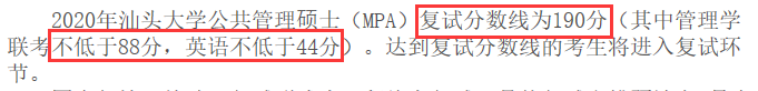 汕頭大學2020年MPA復試基本分數線:190/88/44