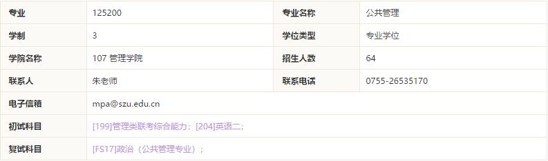 2010年,經國務院學位委員會批準,深圳大學獲準為公共管理碩士(MPA)專業學位研究生培養單位。目前的專業方向為公共政策與特區發展、城市管理與社會治理兩個方向,為公共管理人員提供了更新知識和提升能力的有效途徑。