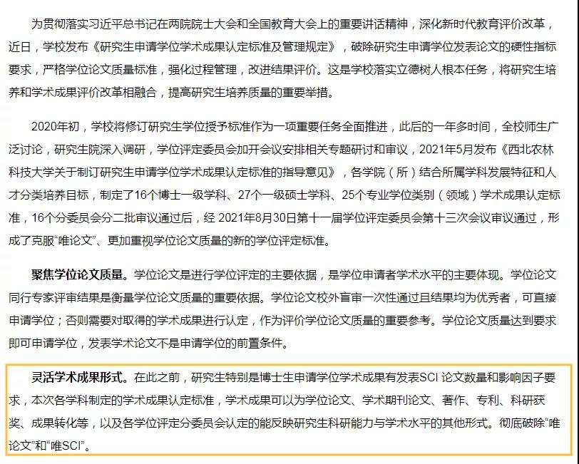 近日,西北農(nóng)林科技大學(xué)發(fā)布《研究生申請(qǐng)學(xué)位學(xué)術(shù)成果認(rèn)定標(biāo)準(zhǔn)及管理規(guī)定,其中提及學(xué)位論文質(zhì)量達(dá)到要求即可申請(qǐng)學(xué)位,發(fā)表學(xué)術(shù)論文不是申請(qǐng)學(xué)位的前置條件。徹底破除“唯論文”和“唯SCI”。