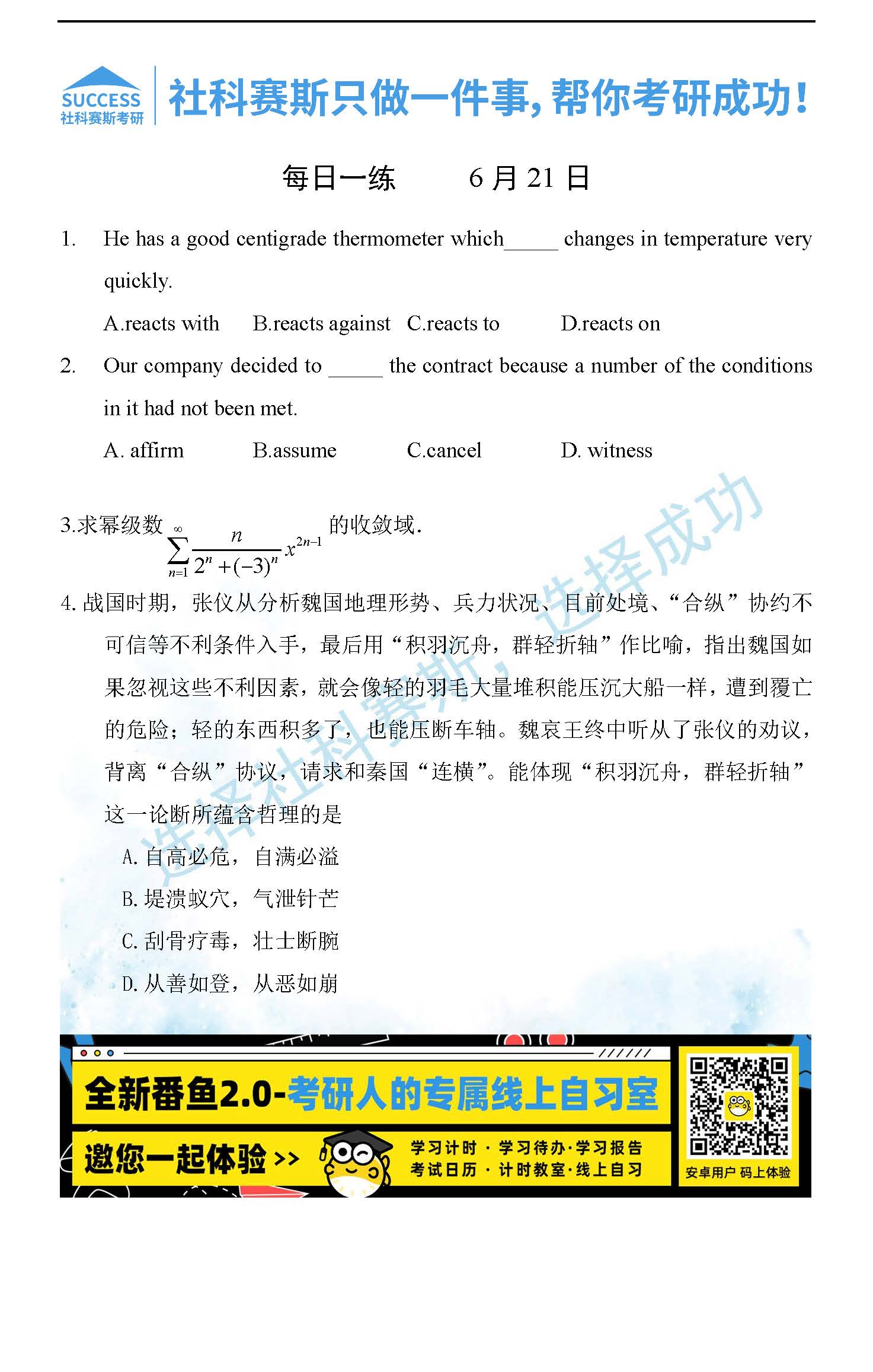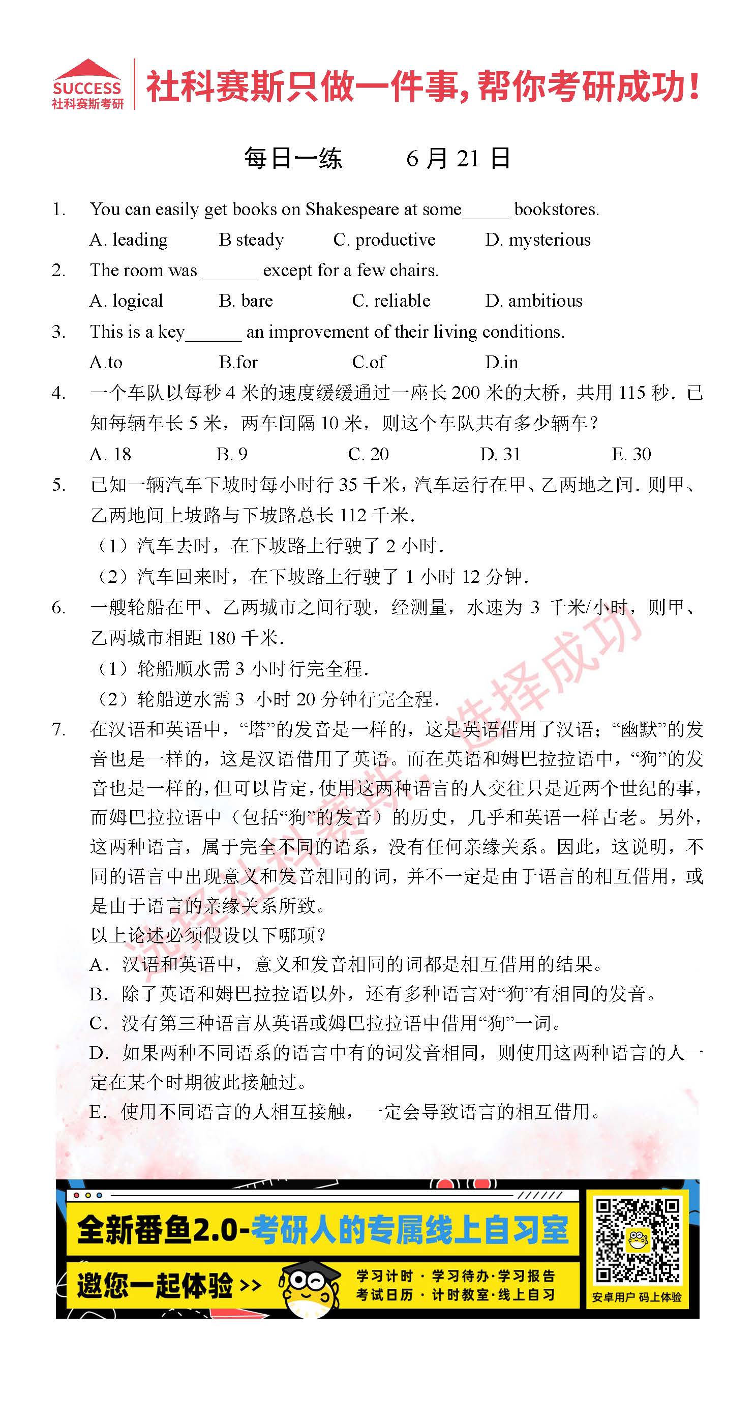 導讀:考研是一場持久戰,保持良好的學習習慣,是能確保復習高效的關鍵。今天社科賽斯MBA備考網小編整理了“2022管理類聯考6月21日每日一練及答案”的內容,希望能對廣大考生有所幫助。