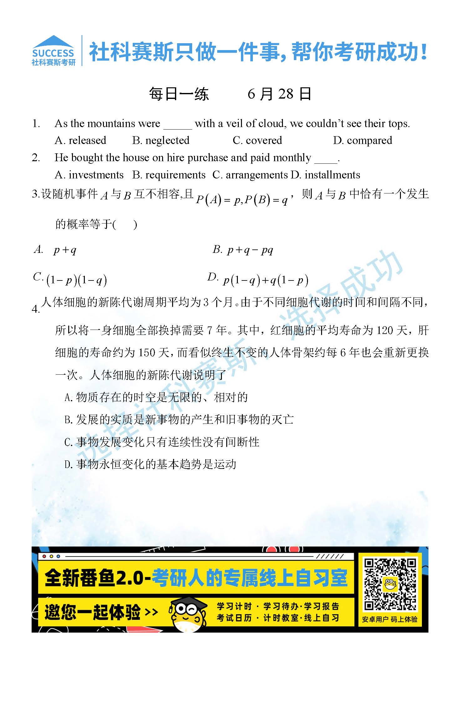 導(dǎo)讀:考研是一場(chǎng)持久戰(zhàn),保持良好的學(xué)習(xí)習(xí)慣,是能確保復(fù)習(xí)高效的關(guān)鍵。今天社科賽斯MBA備考網(wǎng)小編整理了“2022管理類聯(lián)考6月28日每日一練及答案”的內(nèi)容,希望能對(duì)廣大考生有所幫助。