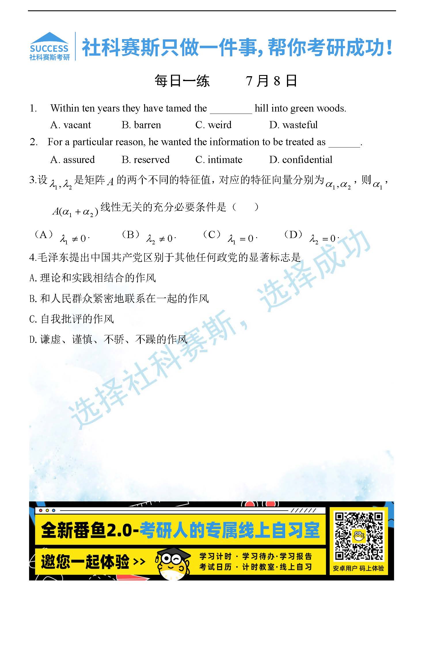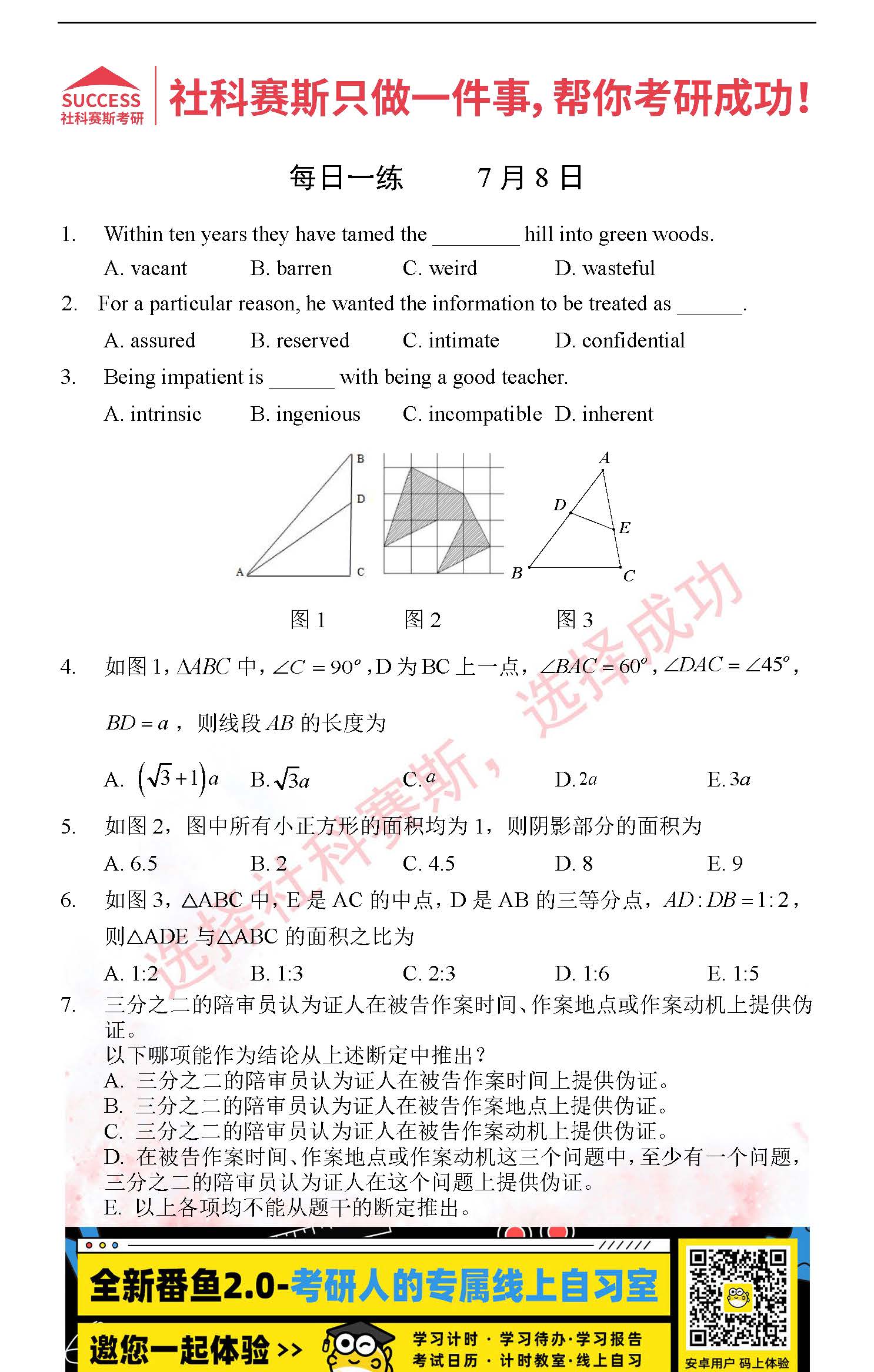以上就是社科賽斯MBA備考網小編為大家整理“2022管理類聯考7月8日每日一練及答案”的全部內容,希望各位考生堅持利用起來,更多每日一練內容請持續關注MBA備考網管理類聯考每日一練。
