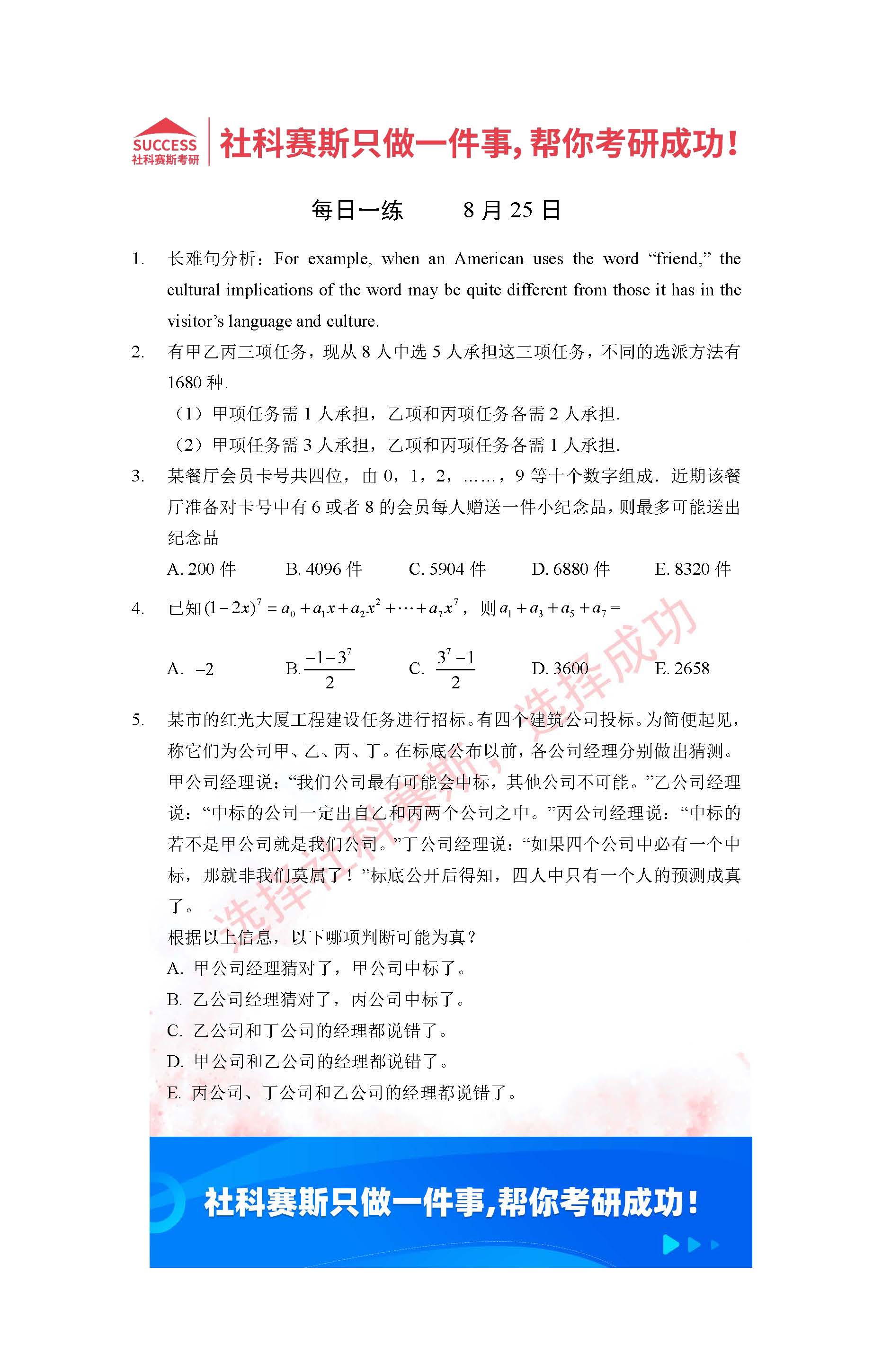 導讀:考研是一場持久戰,保持良好的學習習慣,是能確保復習高效的關鍵。今天社科賽斯MBA備考網小編整理了“2022管理類聯考8月25日每日一練及答案”的內容,希望能對廣大考生有所幫助。