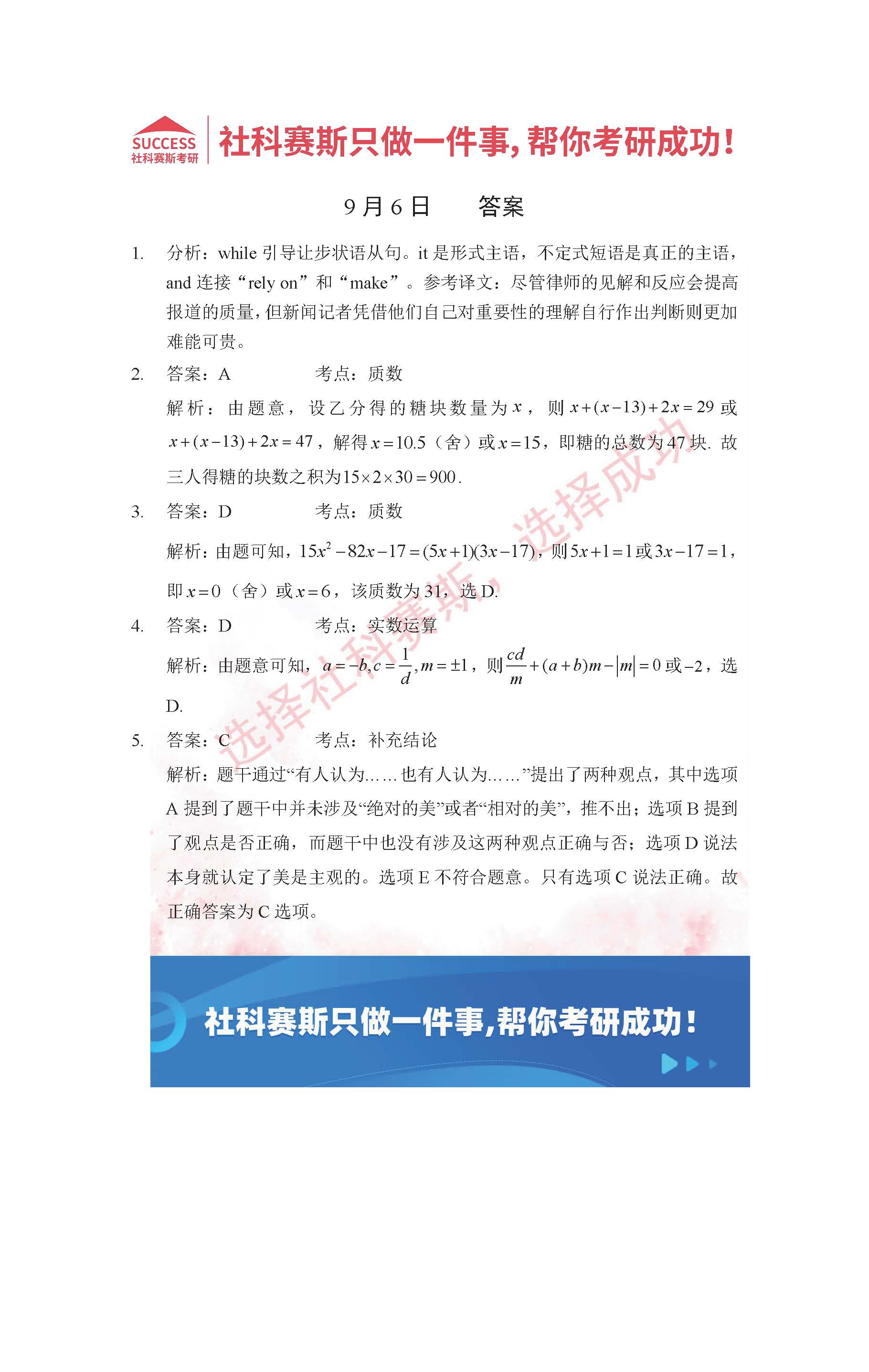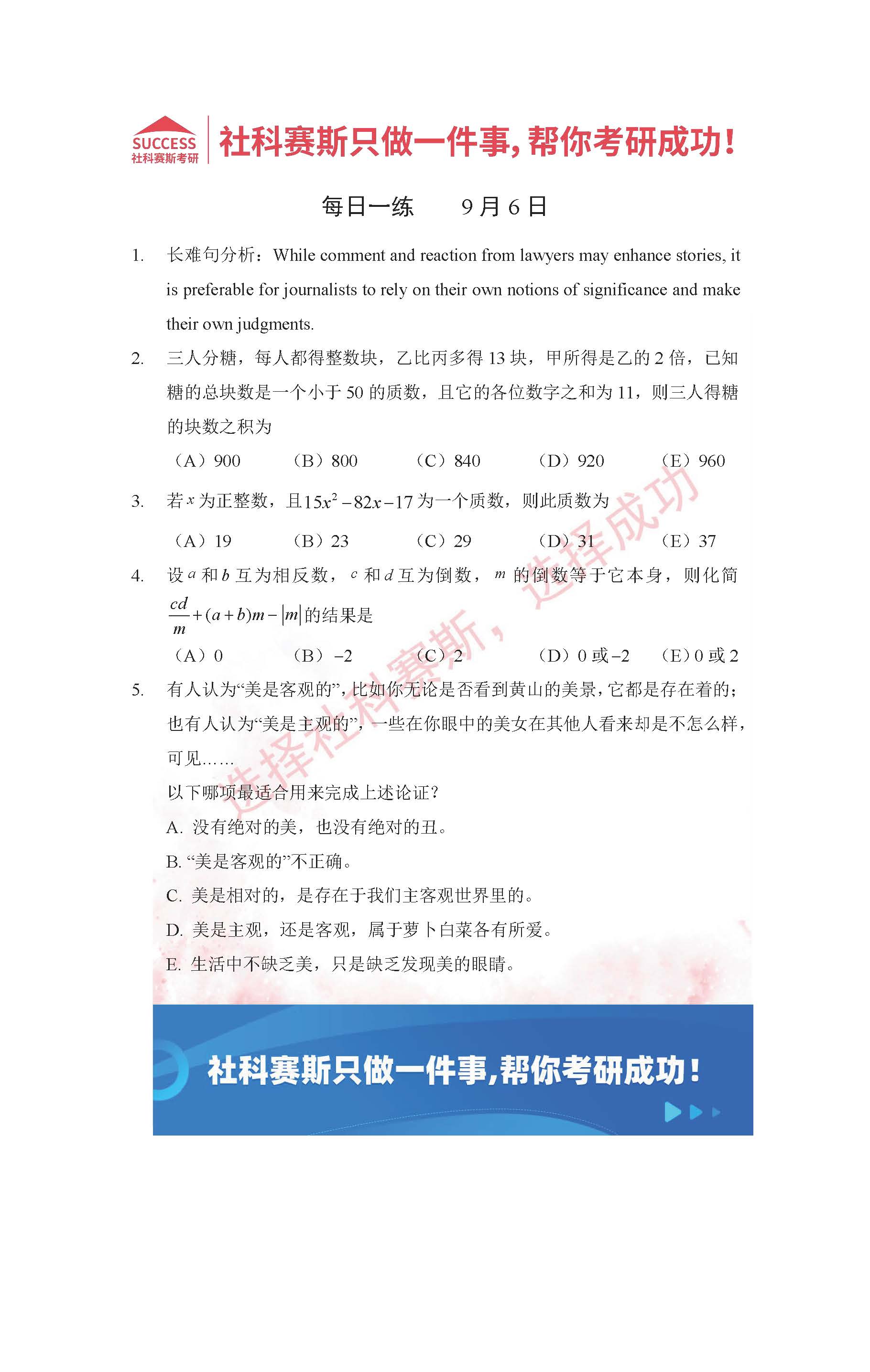 導(dǎo)讀:考研是一場(chǎng)持久戰(zhàn),保持良好的學(xué)習(xí)習(xí)慣,是能確保復(fù)習(xí)高效的關(guān)鍵。今天社科賽斯MBA備考網(wǎng)小編整理了“2022管理類(lèi)聯(lián)考9月6日每日一練及答案”的內(nèi)容,希望能對(duì)廣大考生有所幫助。