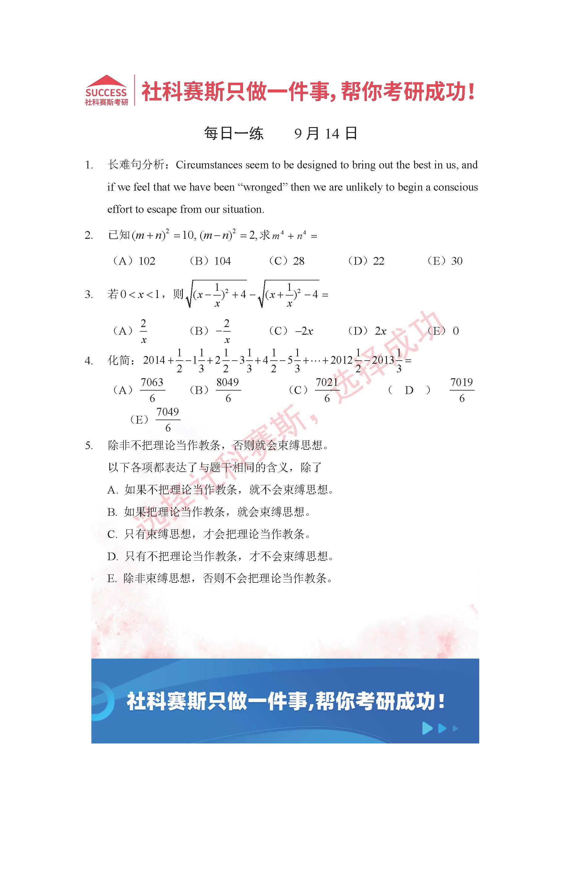 導讀:考研是一場持久戰,保持良好的學習習慣,是能確保復習高效的關鍵。今天社科賽斯MBA備考網小編整理了“2022管理類聯考9月14日每日一練及答案”的內容,希望能對廣大考生有所幫助。