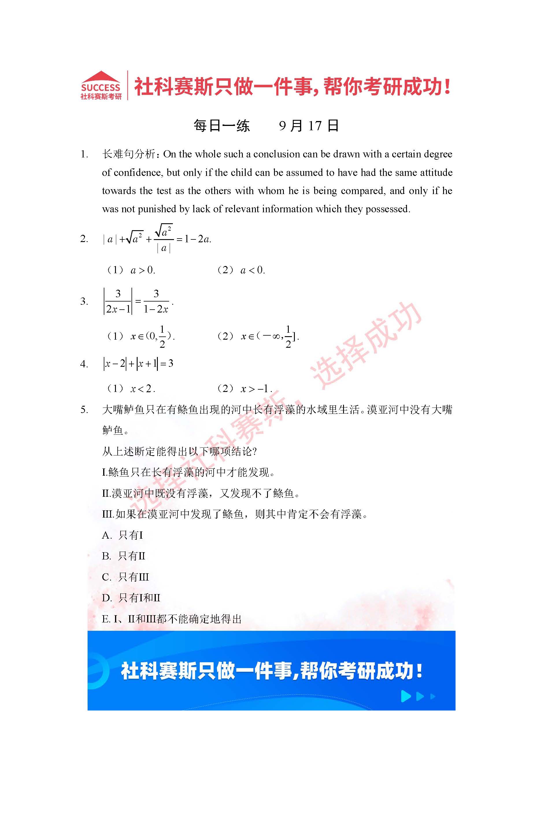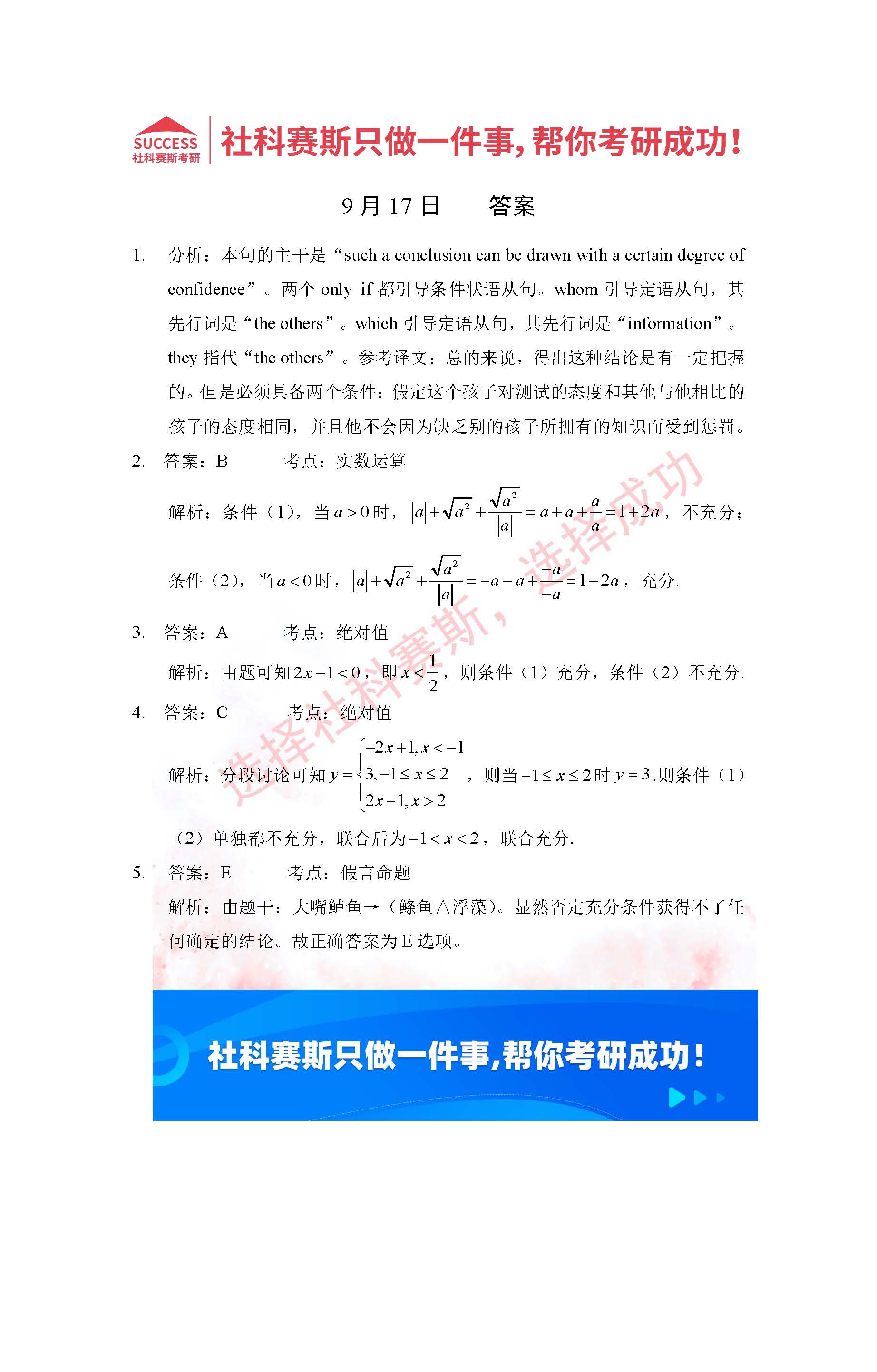 導(dǎo)讀:考研是一場(chǎng)持久戰(zhàn),保持良好的學(xué)習(xí)習(xí)慣,是能確保復(fù)習(xí)高效的關(guān)鍵。今天社科賽斯MBA備考網(wǎng)小編整理了“2022管理類聯(lián)考9月17日每日一練及答案”的內(nèi)容,希望能對(duì)廣大考生有所幫助。