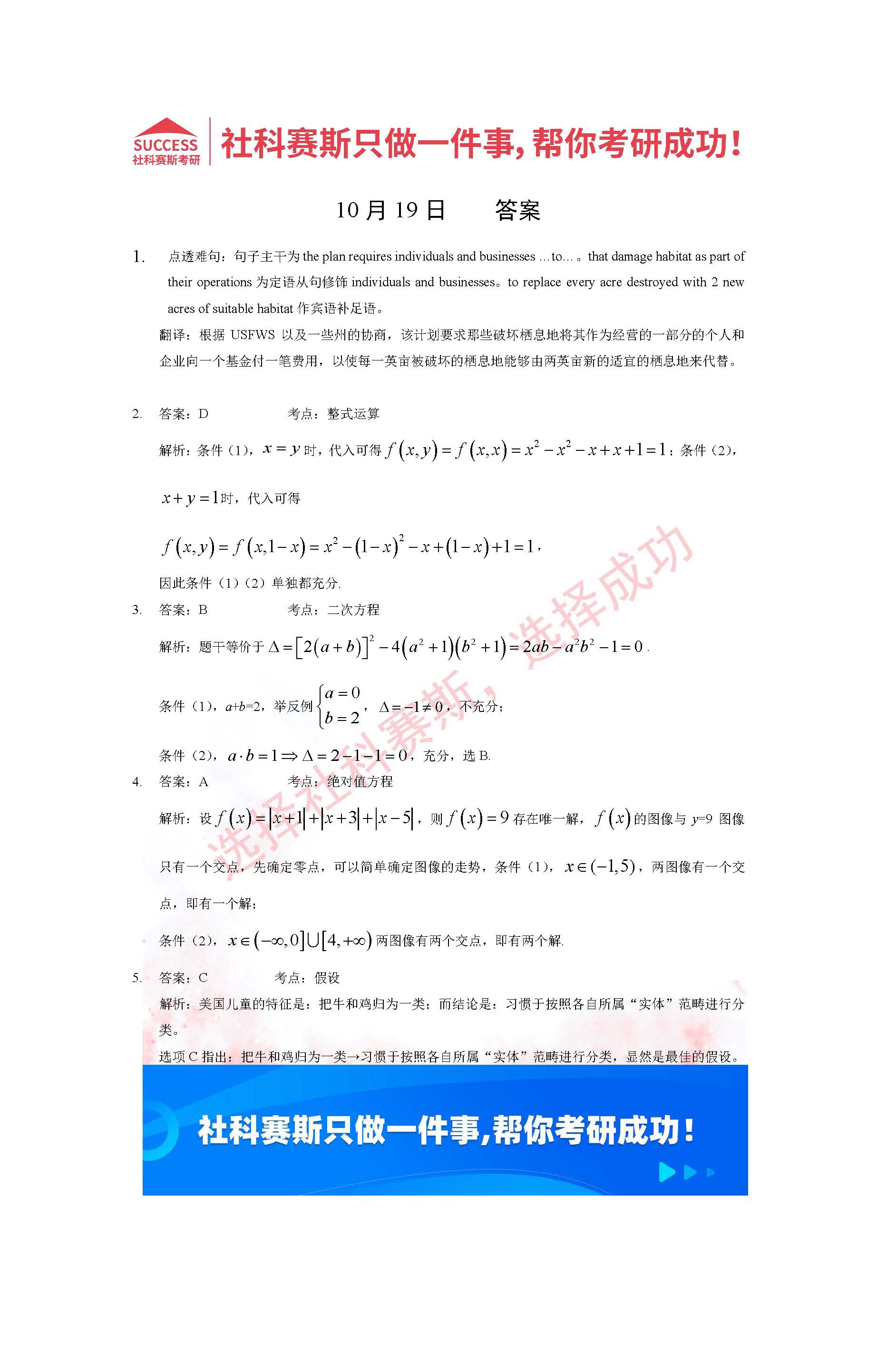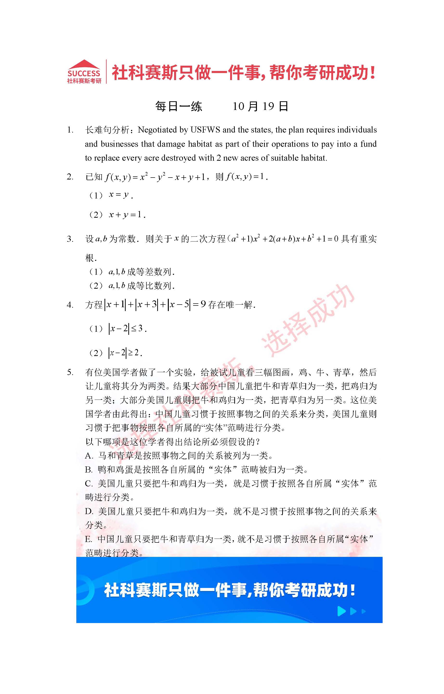 導讀:考研是一場持久戰,保持良好的學習習慣,是能確保復習高效的關鍵。今天社科賽斯MBA備考網小編整理了“2022管理類聯考10月19日每日一練及答案”的內容,希望能對廣大考生有所幫助。