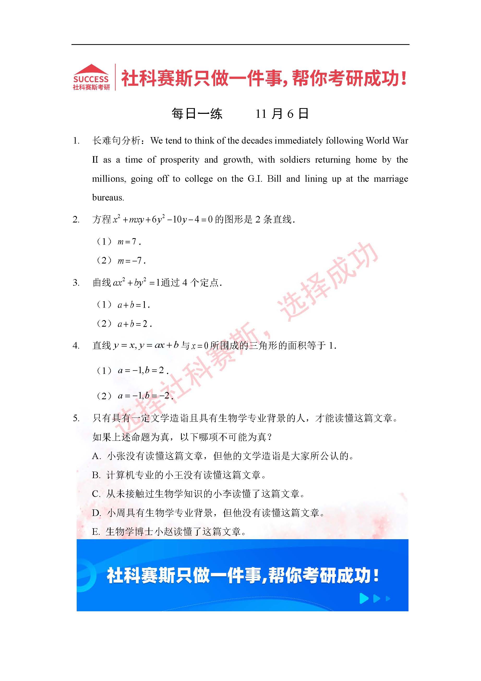 導(dǎo)讀:考研是一場(chǎng)持久戰(zhàn),保持良好的學(xué)習(xí)習(xí)慣,是能確保復(fù)習(xí)高效的關(guān)鍵。今天社科賽斯MBA備考網(wǎng)小編整理了“2022管理類(lèi)聯(lián)考11月6日每日一練及答案”的內(nèi)容,希望能對(duì)廣大考生有所幫助。