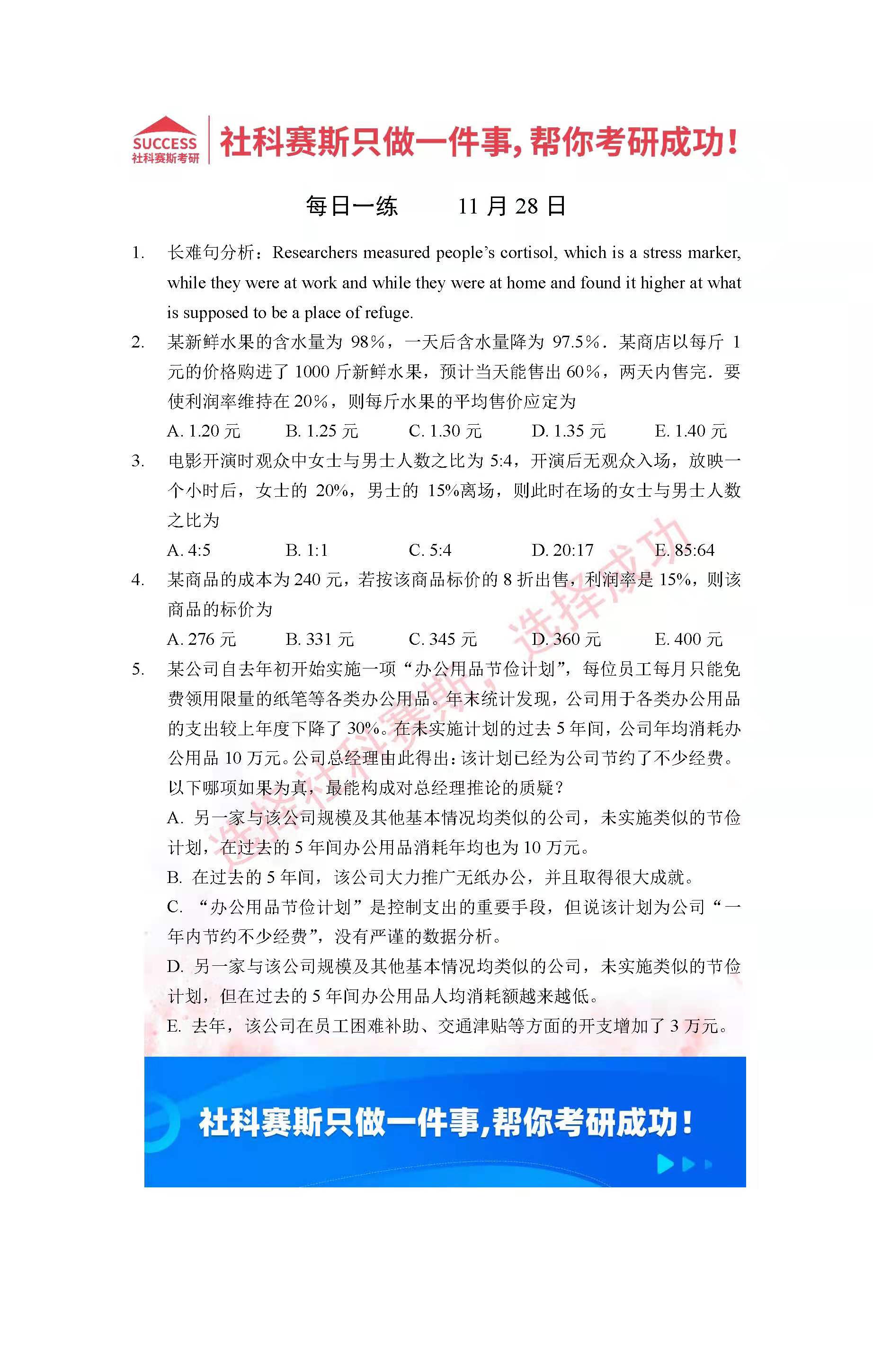 導讀:考研是一場持久戰,保持良好的學習習慣,是能確保復習高效的關鍵。今天社科賽斯MBA備考網小編整理了“2022管理類聯考11月28日每日一練及答案”的內容,希望能對廣大考生有所幫助。