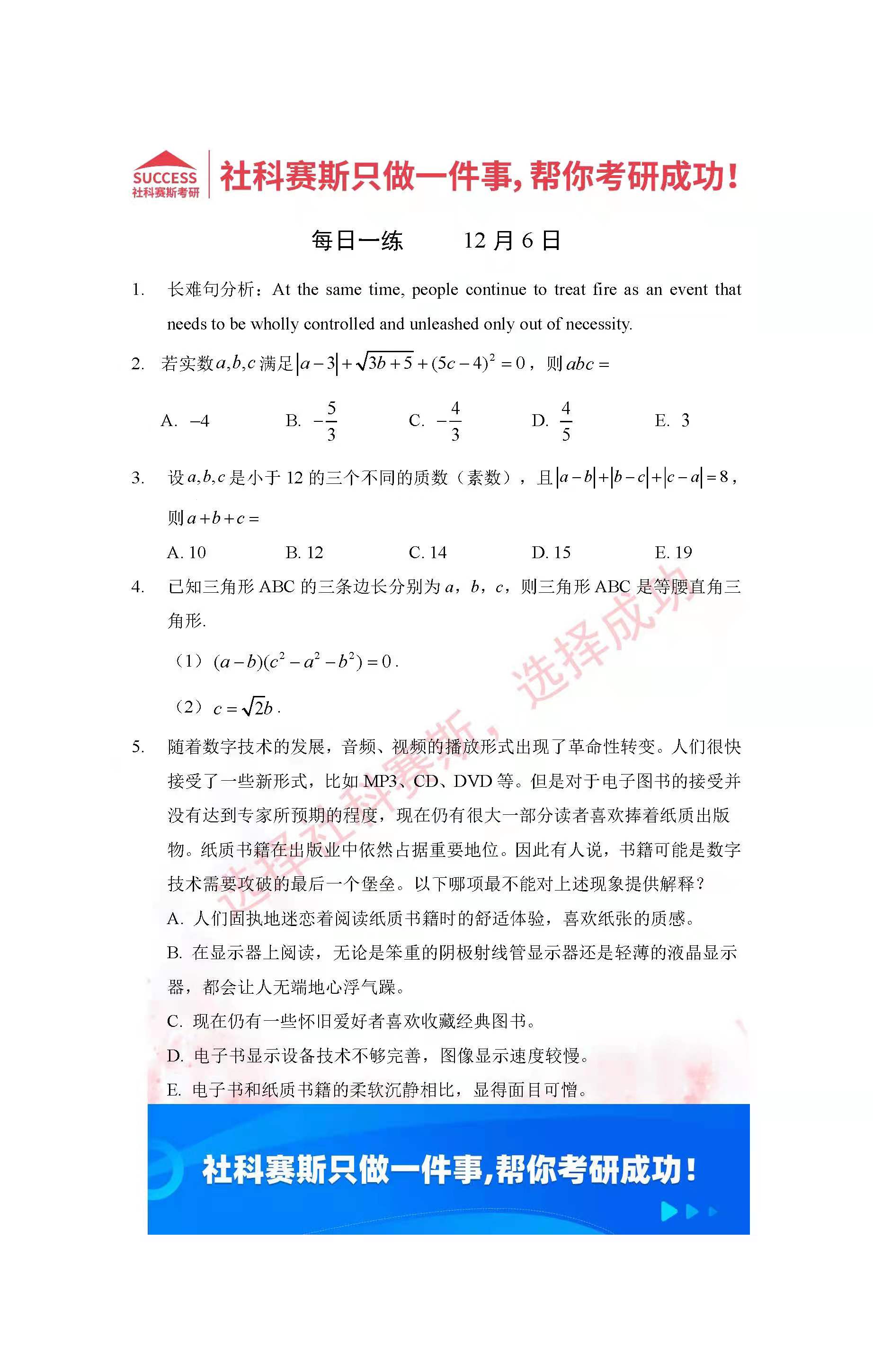 導讀:考研是一場持久戰,保持良好的學習習慣,是能確保復習高效的關鍵。今天社科賽斯MBA備考網小編整理了“2022管理類聯考12月6日每日一練及答案”的內容,希望能對廣大考生有所幫助。