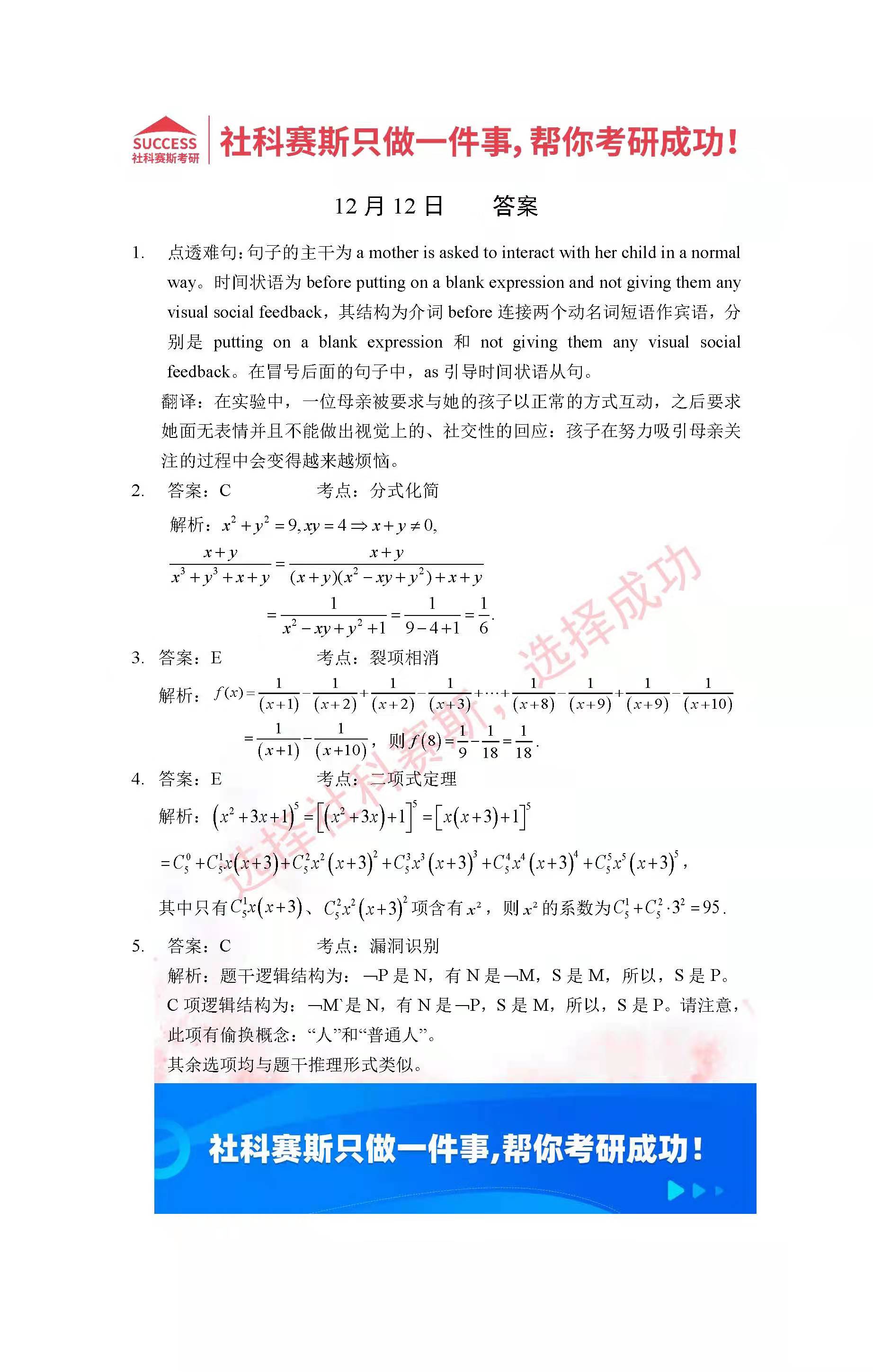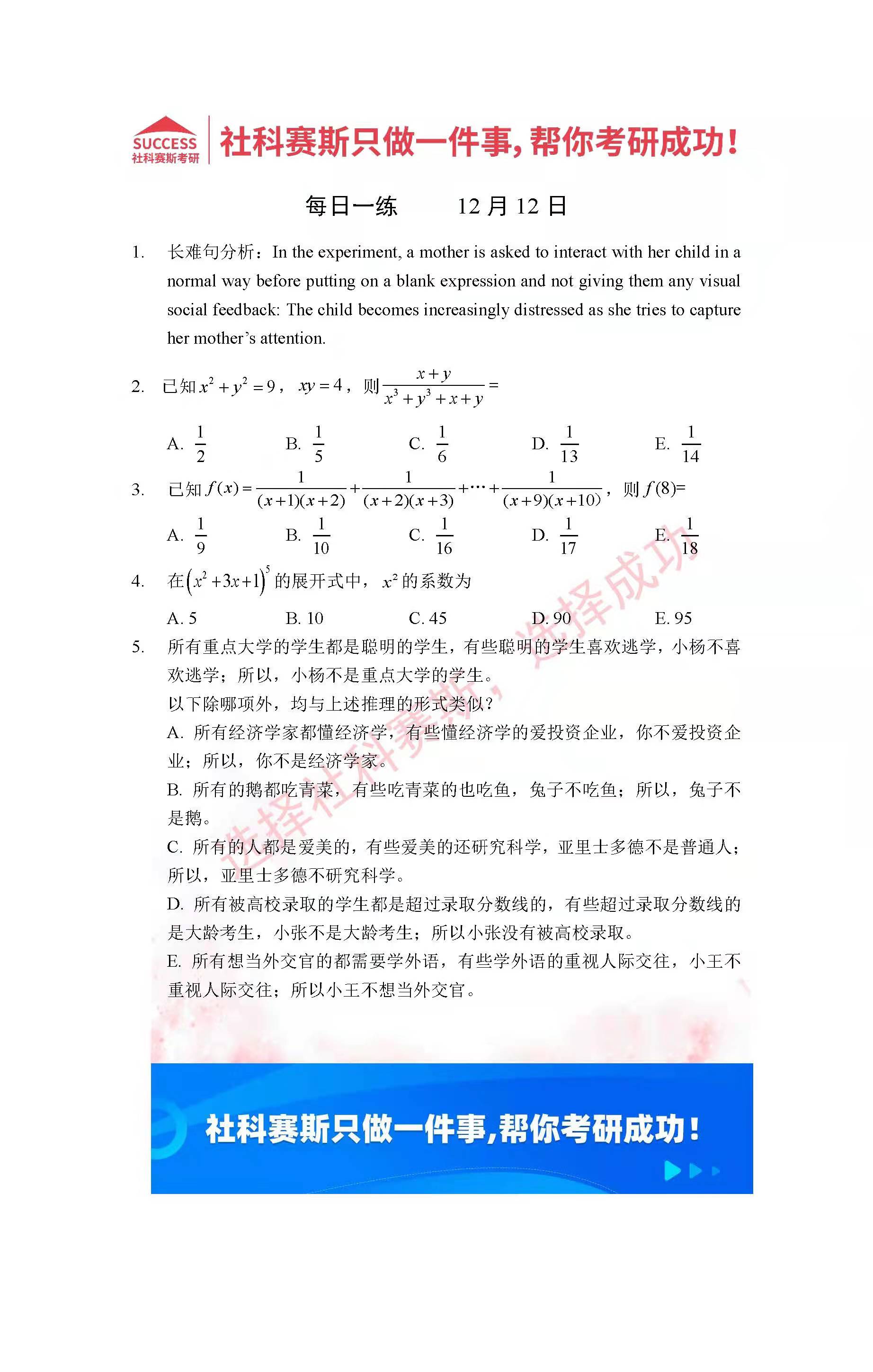 導讀:考研是一場持久戰,保持良好的學習習慣,是能確保復習高效的關鍵。今天社科賽斯MBA備考網小編整理了“2022管理類聯考12月12日每日一練及答案”的內容,希望能對廣大考生有所幫助。