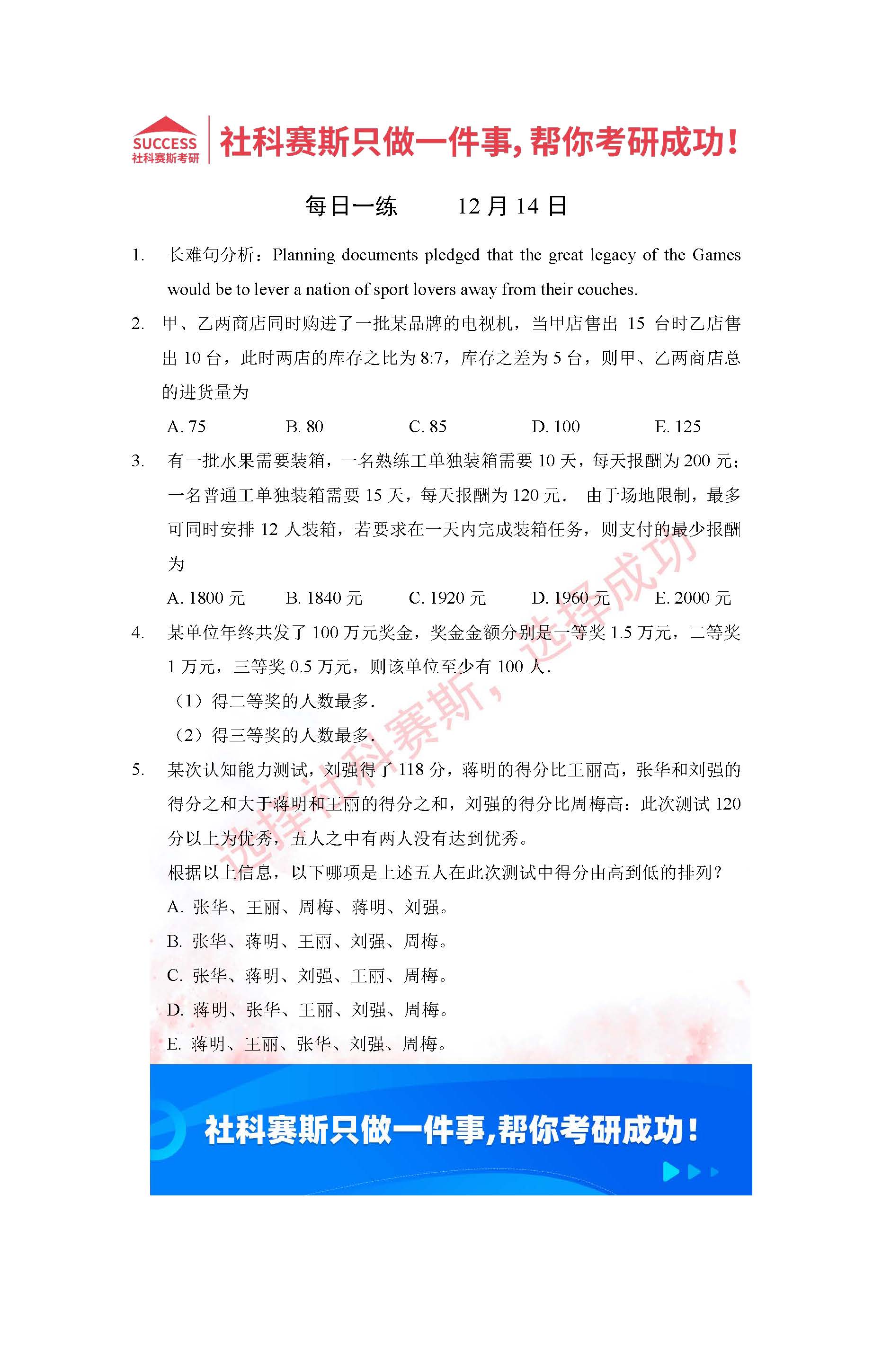 導讀:考研是一場持久戰,保持良好的學習習慣,是能確保復習高效的關鍵。今天社科賽斯MBA備考網小編整理了“2022管理類聯考12月14日每日一練及答案”的內容,希望能對廣大考生有所幫助。