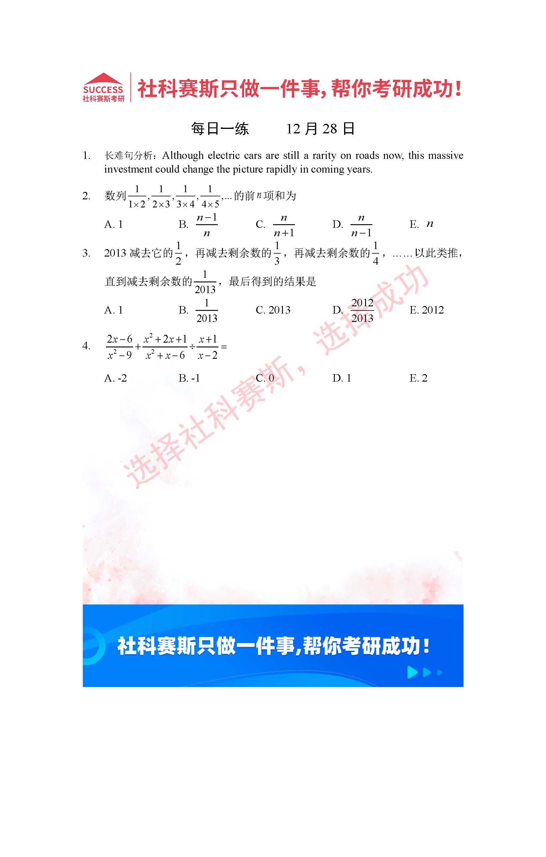 導(dǎo)讀:考研是一場(chǎng)持久戰(zhàn),保持良好的學(xué)習(xí)習(xí)慣,是能確保復(fù)習(xí)高效的關(guān)鍵。今天社科賽斯MBA備考網(wǎng)小編整理了“2022管理類聯(lián)考12月28日每日一練及答案”的內(nèi)容,希望能對(duì)廣大考生有所幫助。