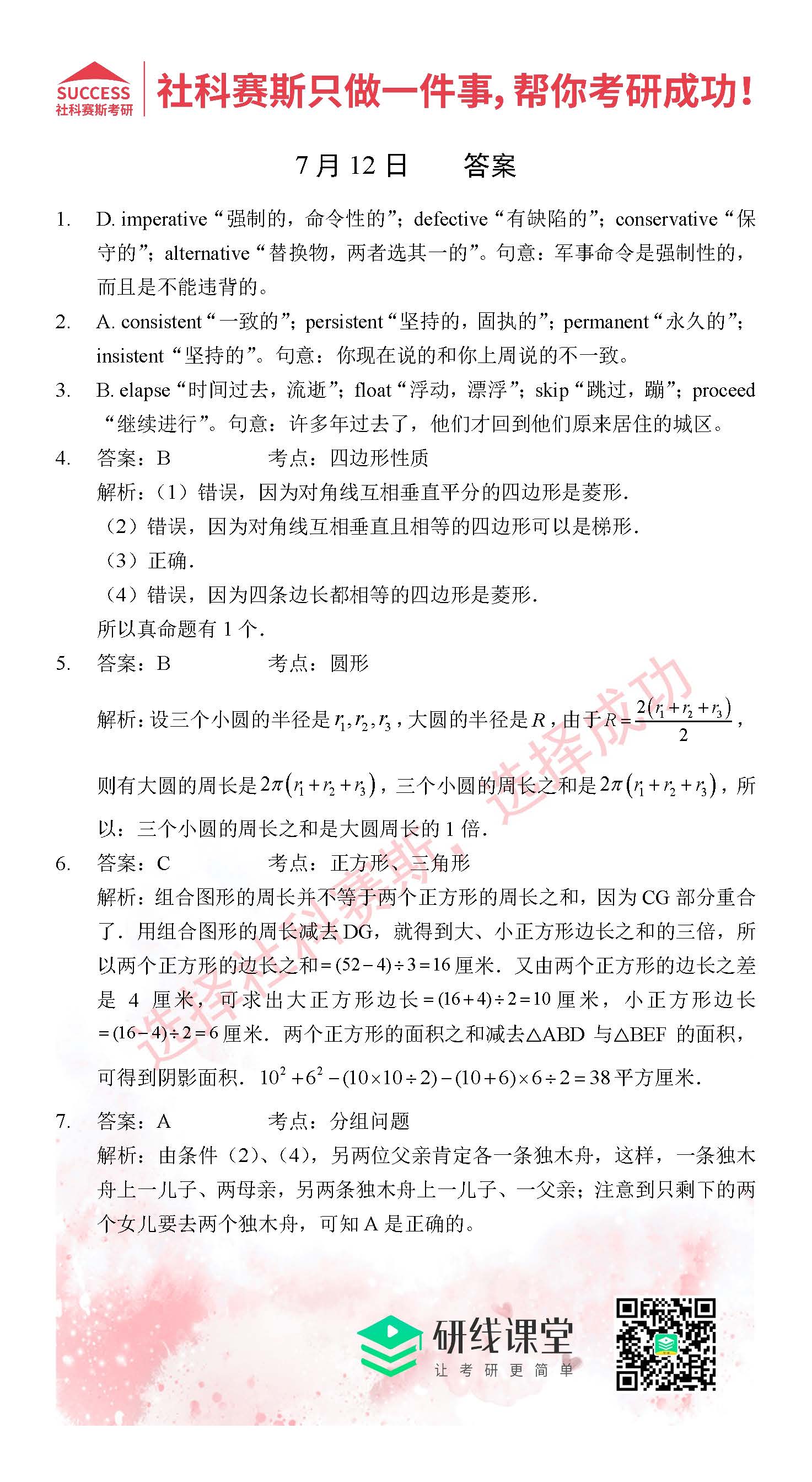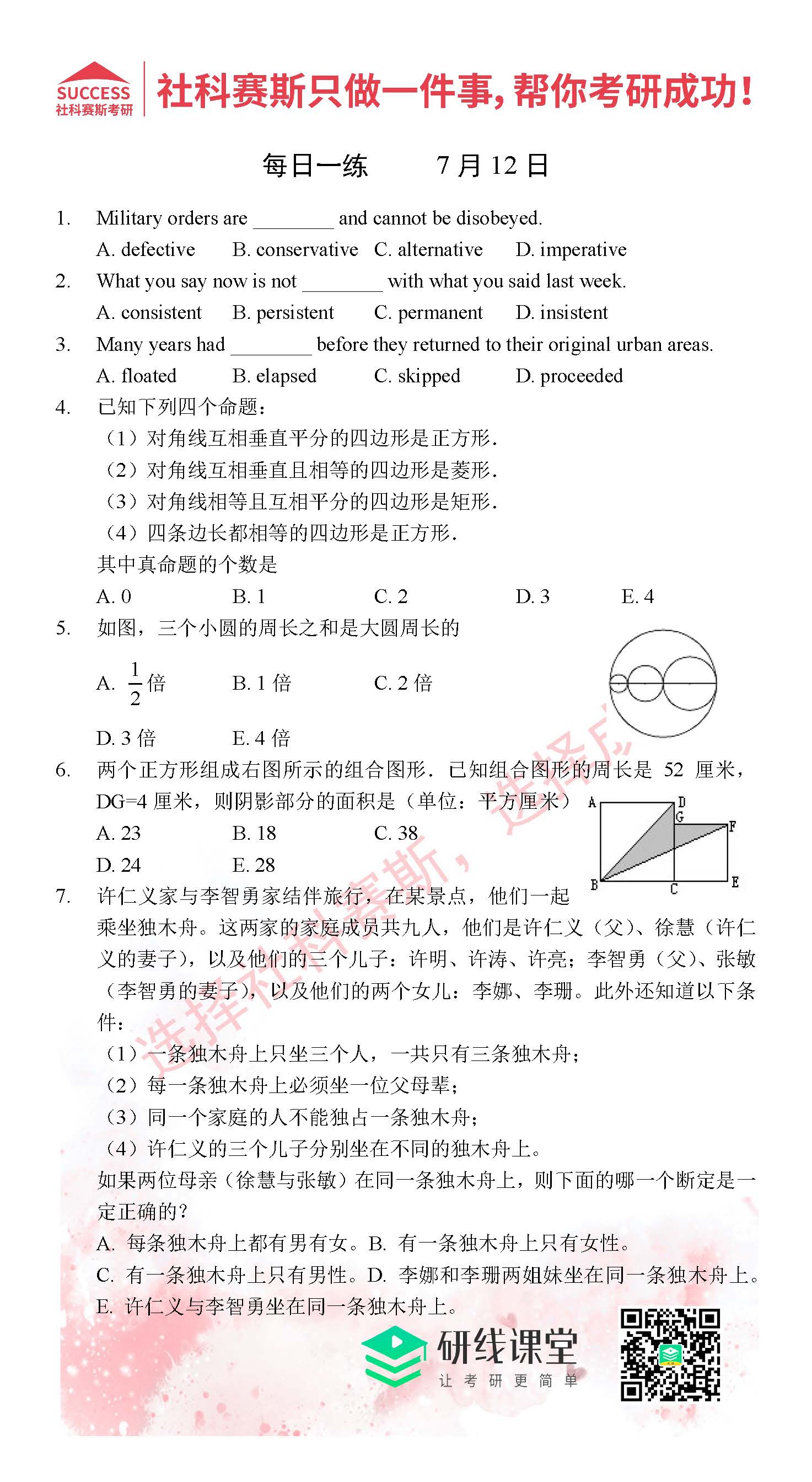 以上就是MBA備考網(wǎng)小編為大家提供的今日的每日一練“2021管理類(lèi)聯(lián)考7月12日每日一練及答案”的全部?jī)?nèi)容,希望各位考生堅(jiān)持利用起來(lái),更多每日一練內(nèi)容請(qǐng)持續(xù)關(guān)注MBA備考網(wǎng)管理類(lèi)聯(lián)考每日一練
