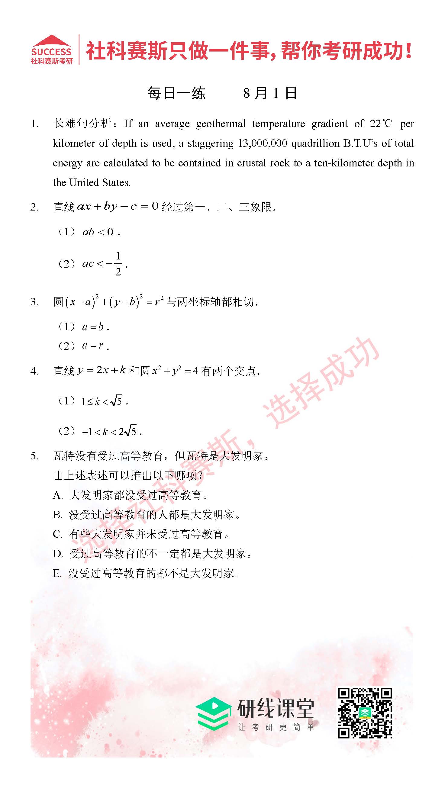導讀:考研是一場持久戰,保持良好的學習習慣,是能確保復習高效的關鍵。MBA備考網小編整理了管綜的每日一練,希望能對廣大考生有所幫助。