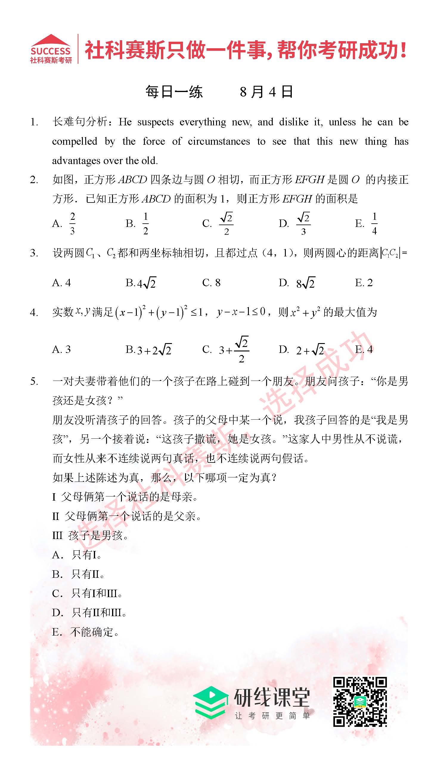 以上就是MBA備考網小編為大家提供的今日每日一練“2021管理類聯考8月4日每日一練及答案”的全部內容,希望各位考生堅持利用起來,更多每日一練內容請持續關注MBA備考網管理類聯考每日一練