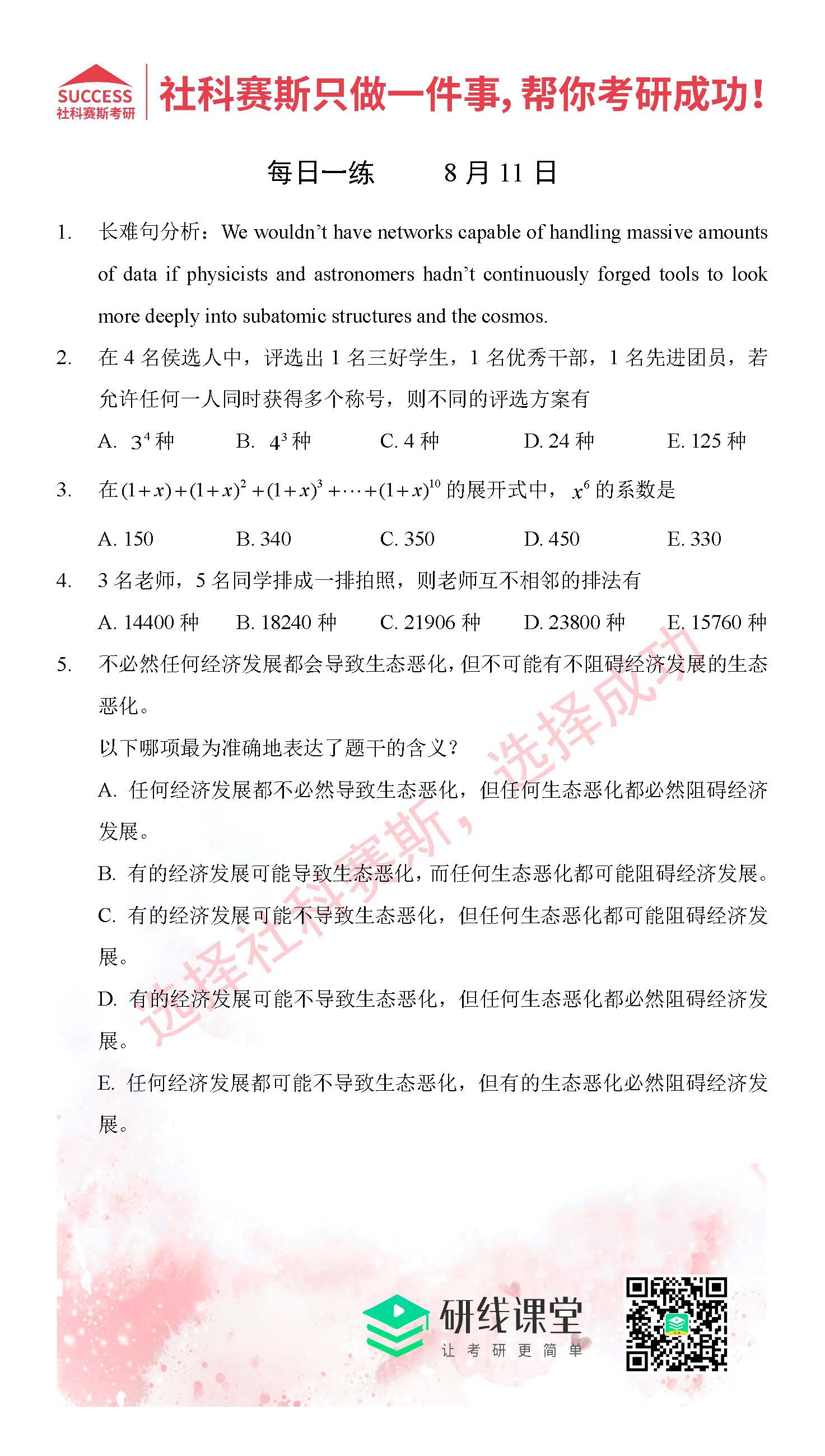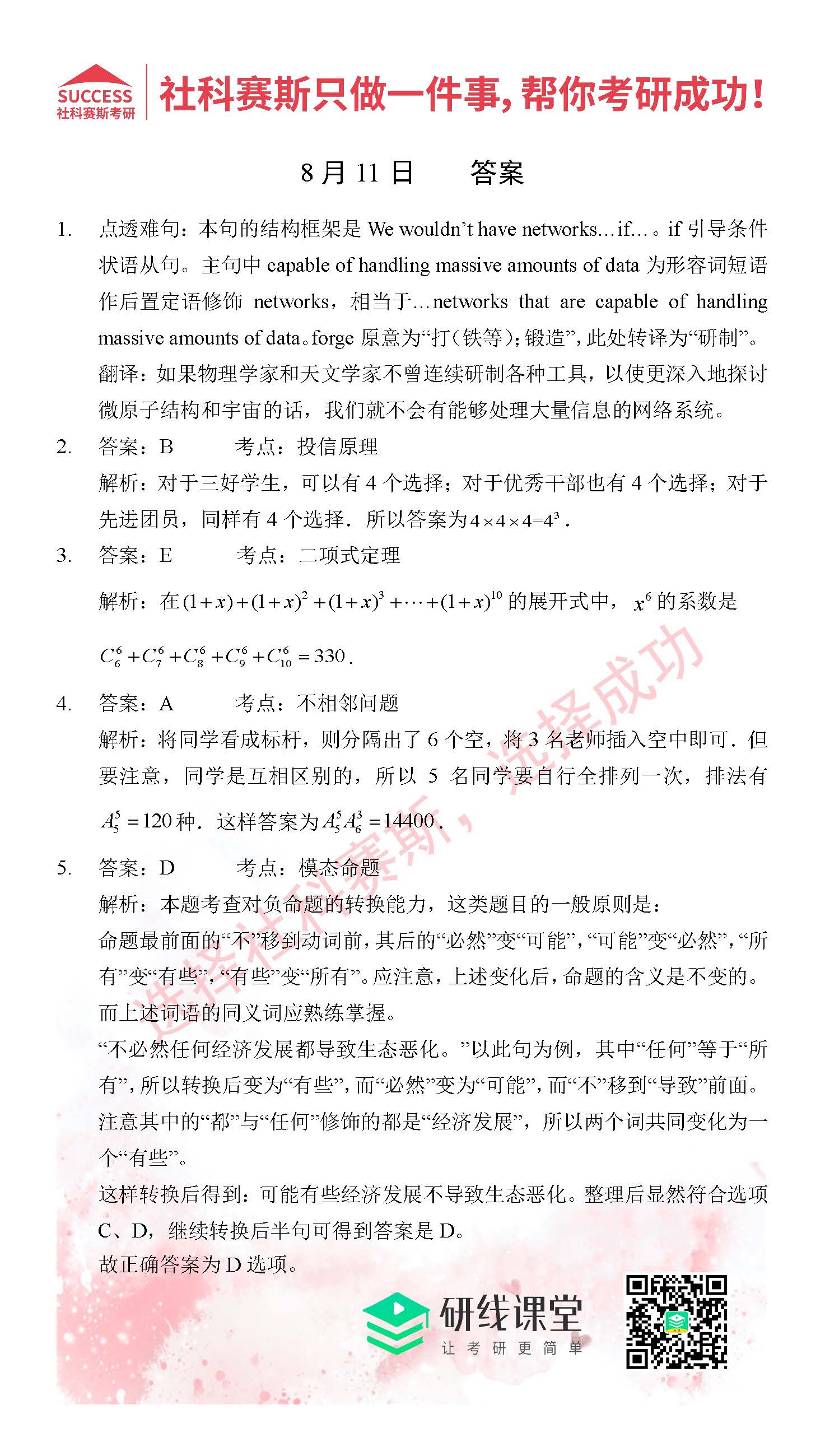 以上就是MBA備考網(wǎng)小編為大家提供的今日每日一練“2021管理類聯(lián)考8月11日每日一練及答案”的全部內(nèi)容,希望各位考生堅持利用起來,更多每日一練內(nèi)容請持續(xù)關(guān)注MBA備考網(wǎng)管理類聯(lián)考每日一練。