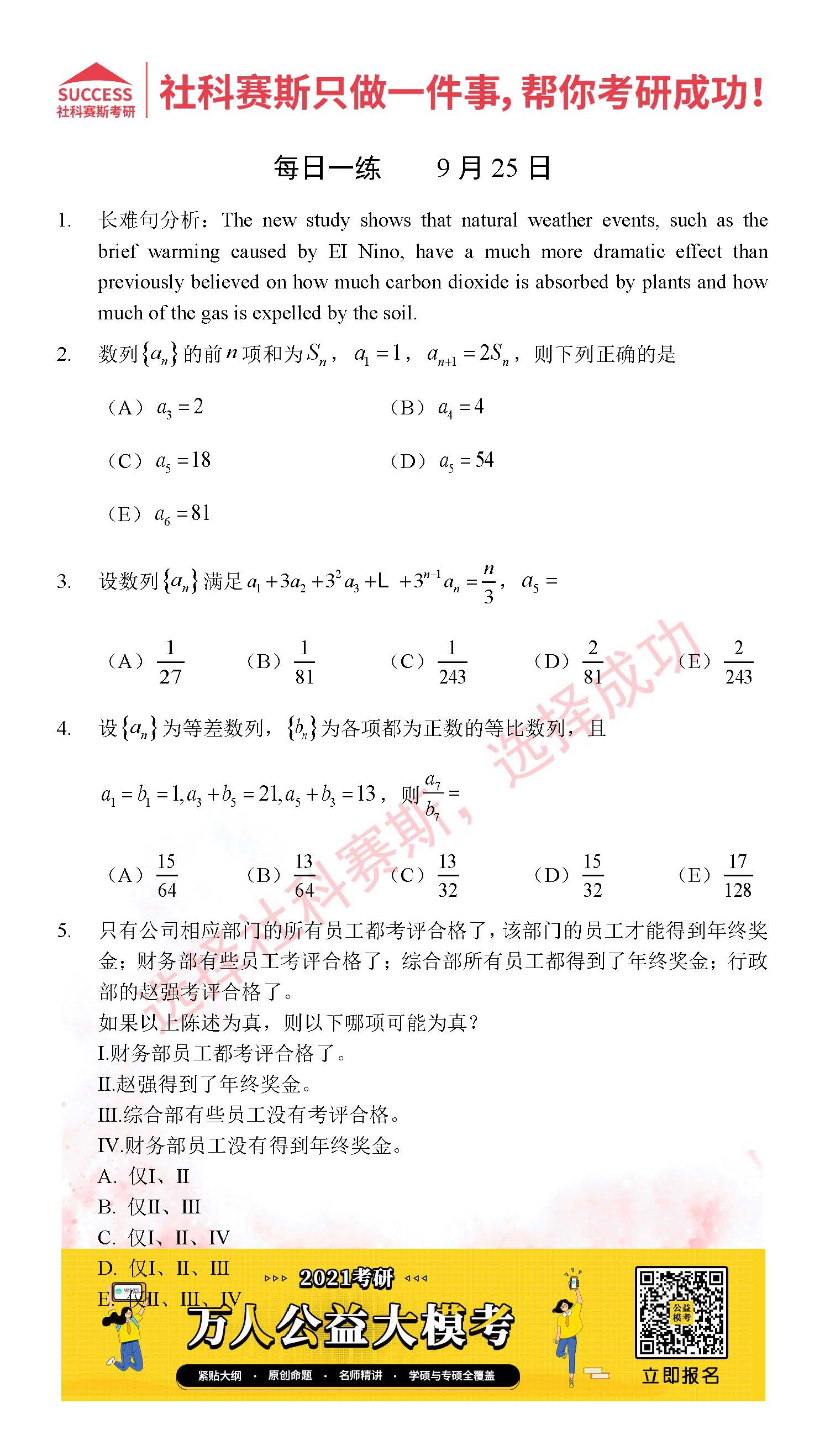 考研是一場持久戰,保持良好的學習習慣,是能確保復習高效的關鍵。今天社科賽斯MBA備考網小編整理了“2021管理類聯考9月25日每日一練及答案”的內容,希望能對廣大考生有所幫助。