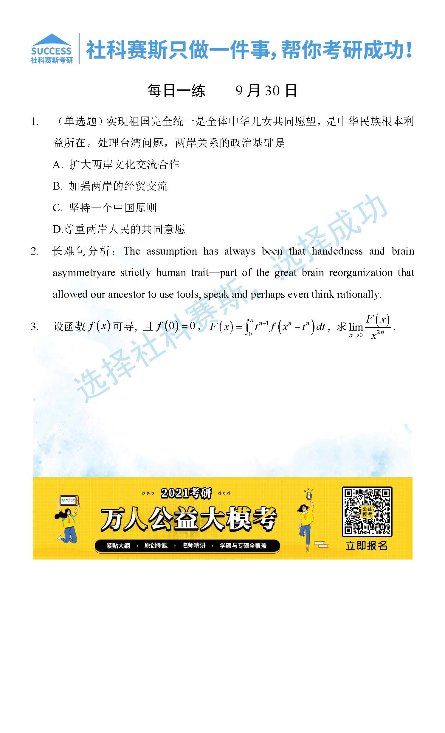 考研是一場持久戰,保持良好的學習習慣,是能確保復習高效的關鍵。今天社科賽斯MBA備考網小編整理了“2021管理類聯考9月30日每日一練及答案”的內容,希望能對廣大考生有所幫助。