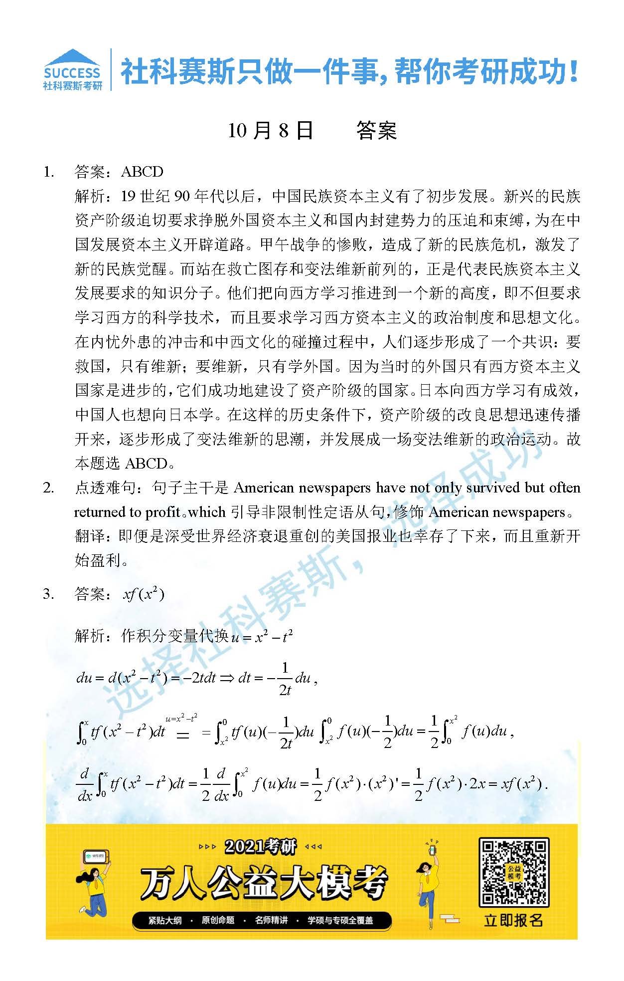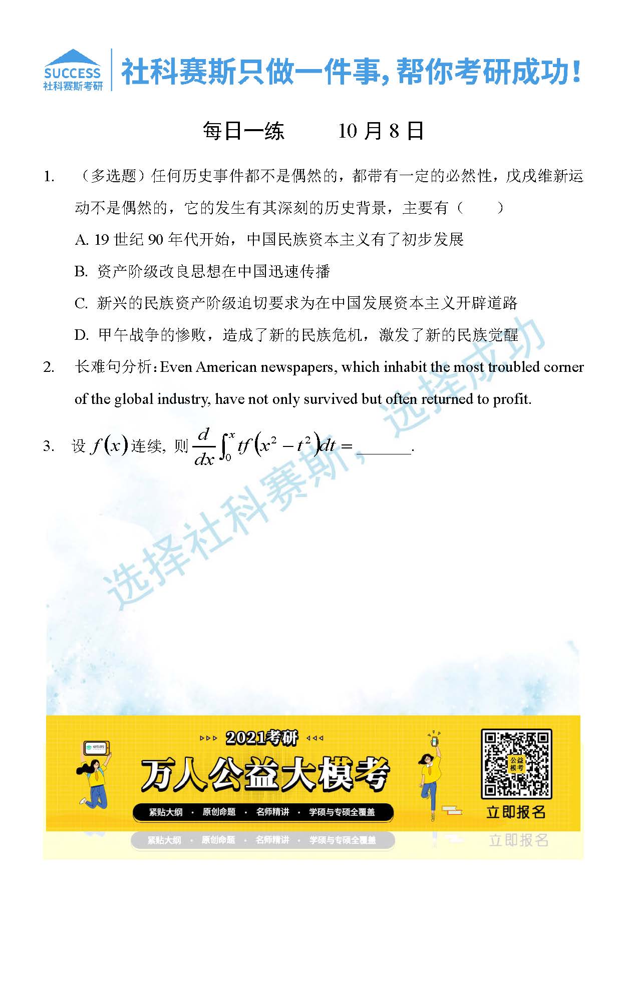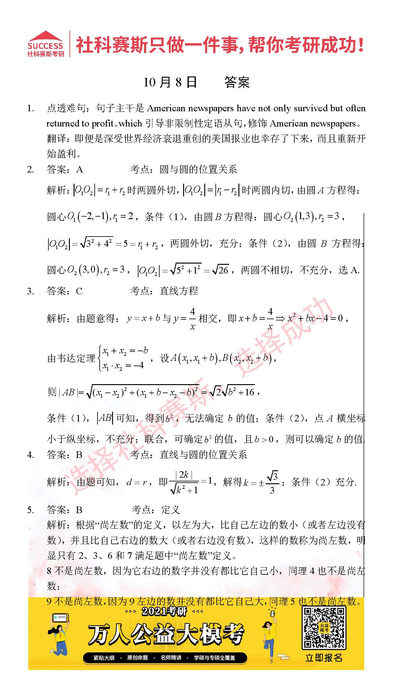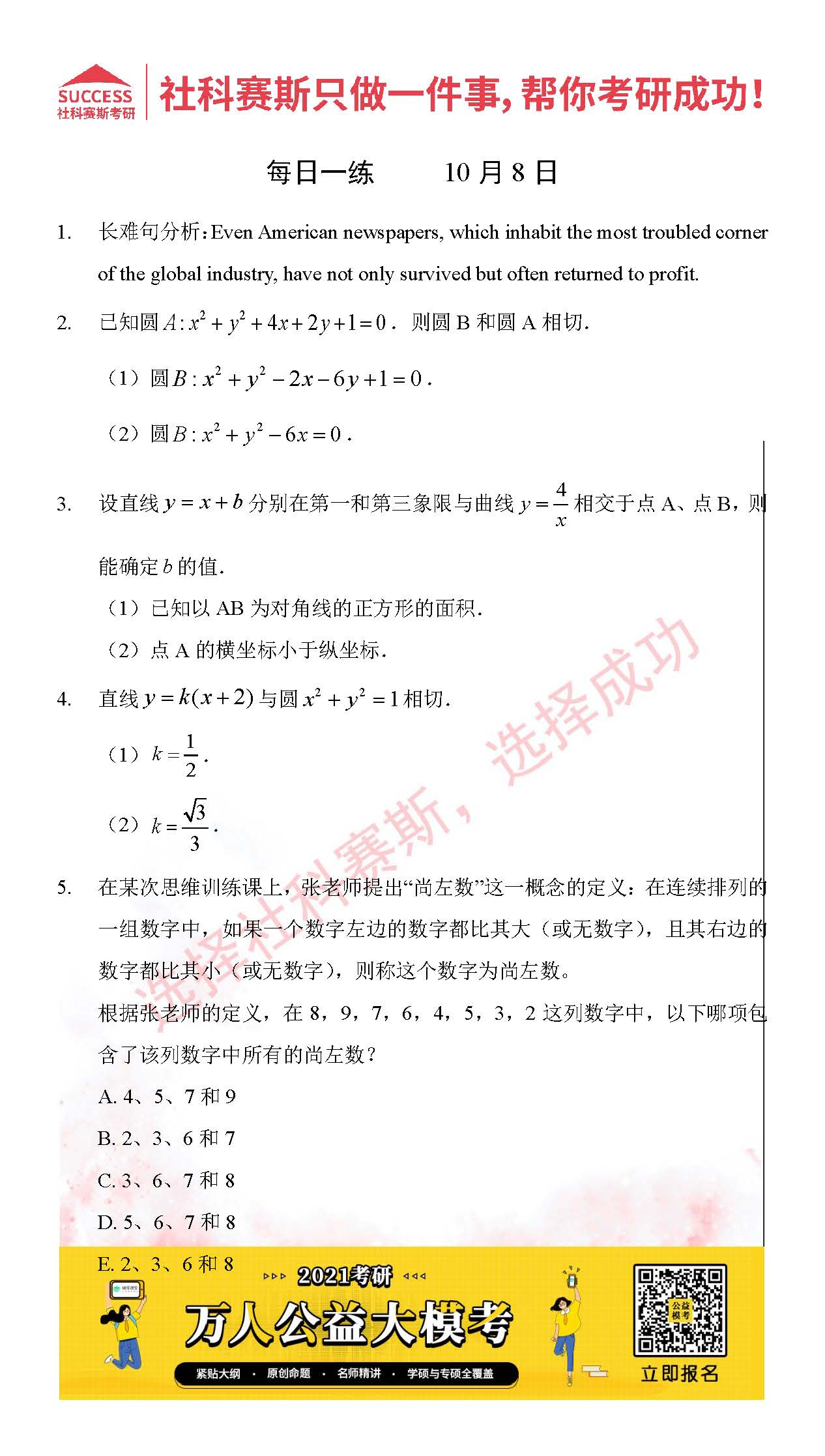 考研是一場(chǎng)持久戰(zhàn),保持良好的學(xué)習(xí)習(xí)慣,是能確保復(fù)習(xí)高效的關(guān)鍵。今天社科賽斯MBA備考網(wǎng)小編整理了“2021管理類聯(lián)考10月8日每日一練及答案”的內(nèi)容,希望能對(duì)廣大考生有所幫助。