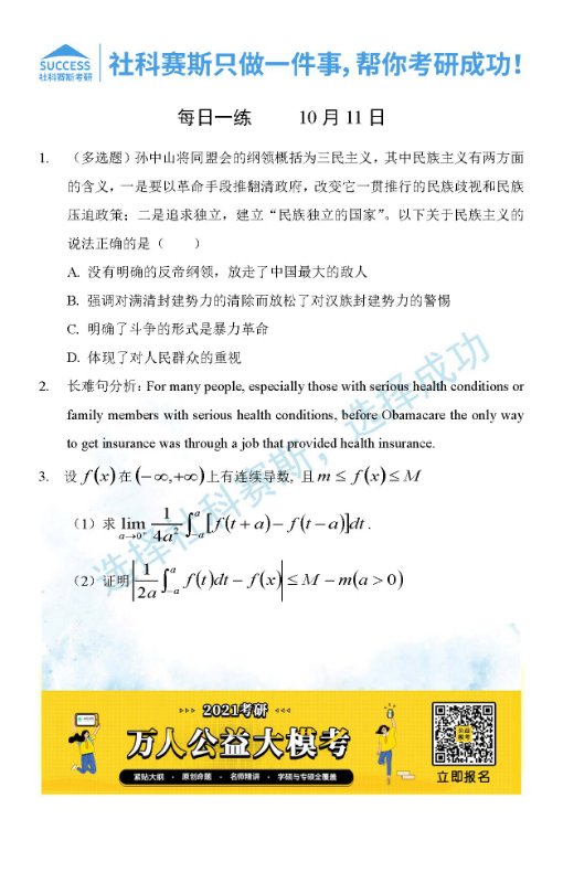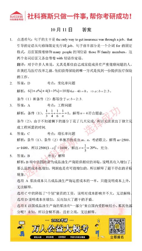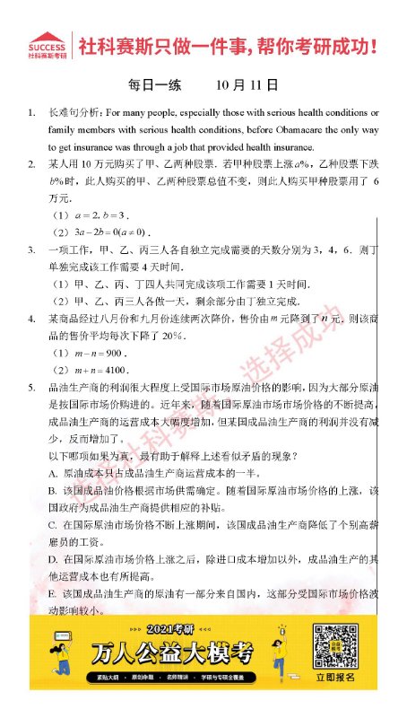 考研是一場(chǎng)持久戰(zhàn),保持良好的學(xué)習(xí)習(xí)慣,是能確保復(fù)習(xí)高效的關(guān)鍵。今天社科賽斯MBA備考網(wǎng)小編整理了“2021管理類(lèi)聯(lián)考10月11日每日一練及答案”的內(nèi)容,希望能對(duì)廣大考生有所幫助。
