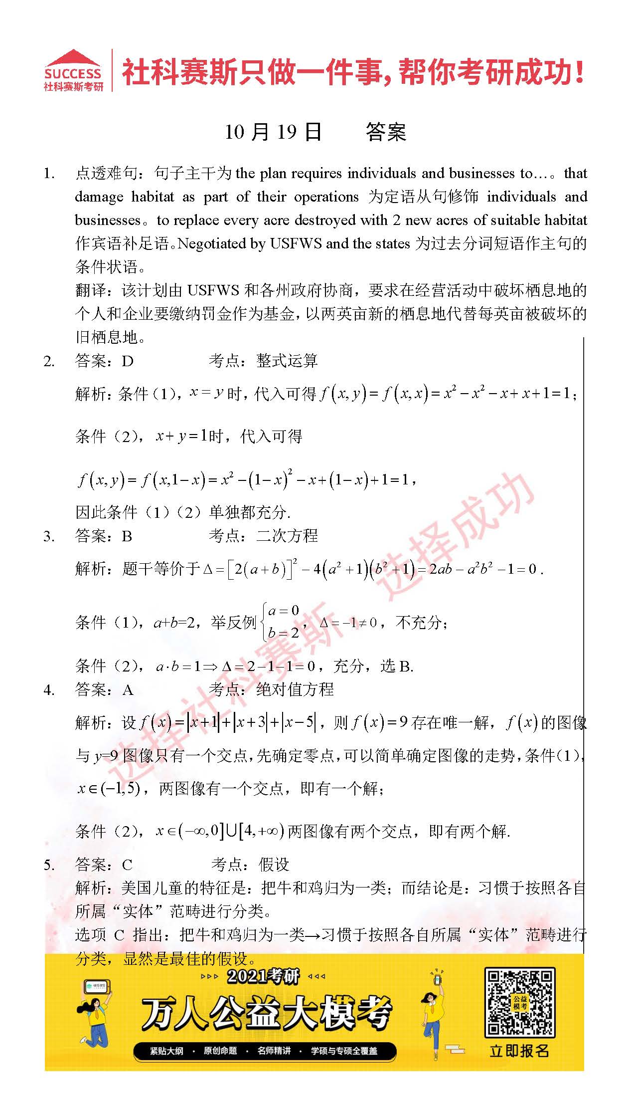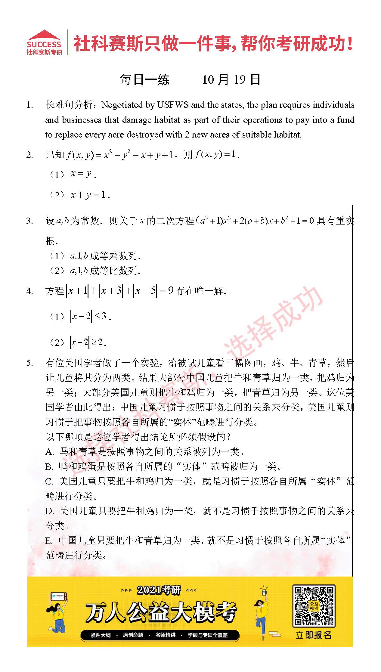 考研是一場持久戰,保持良好的學習習慣,是能確保復習高效的關鍵。今天社科賽斯MBA備考網小編整理了“2021管理類聯考10月19日每日一練及答案”的內容,希望能對廣大考生有所幫助。
