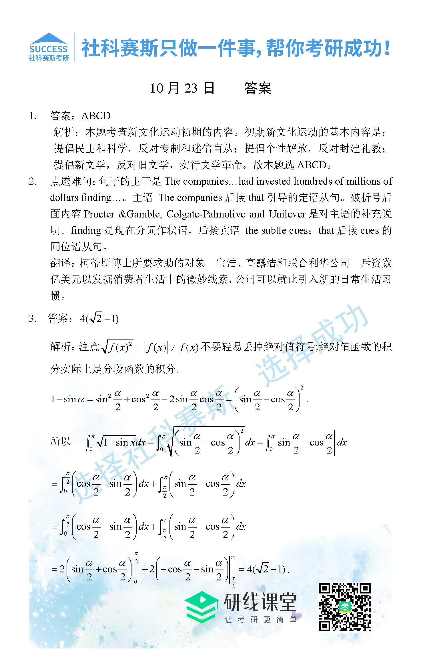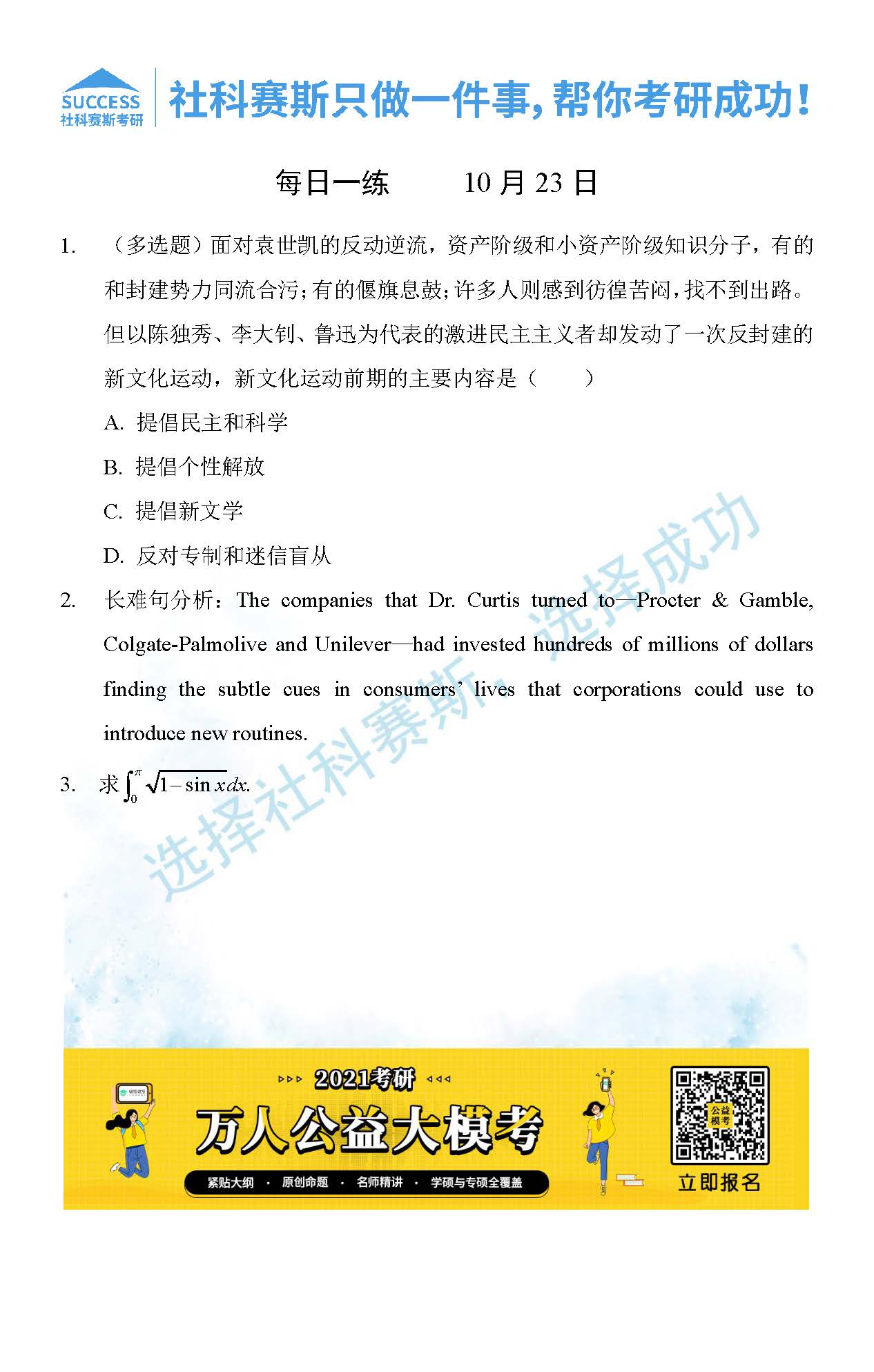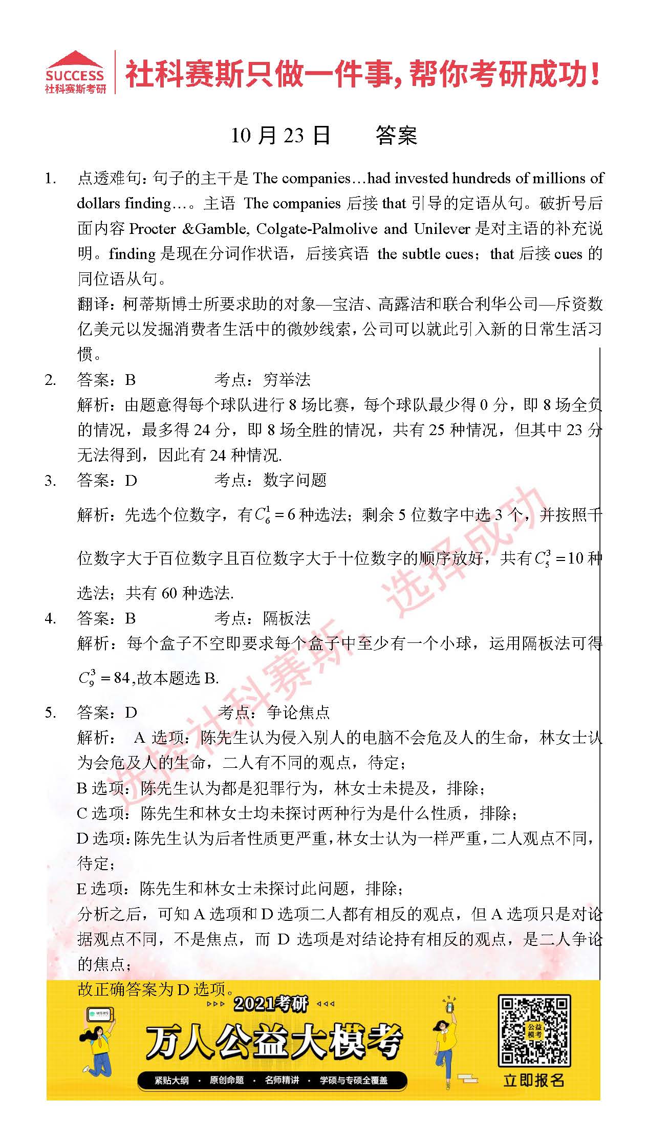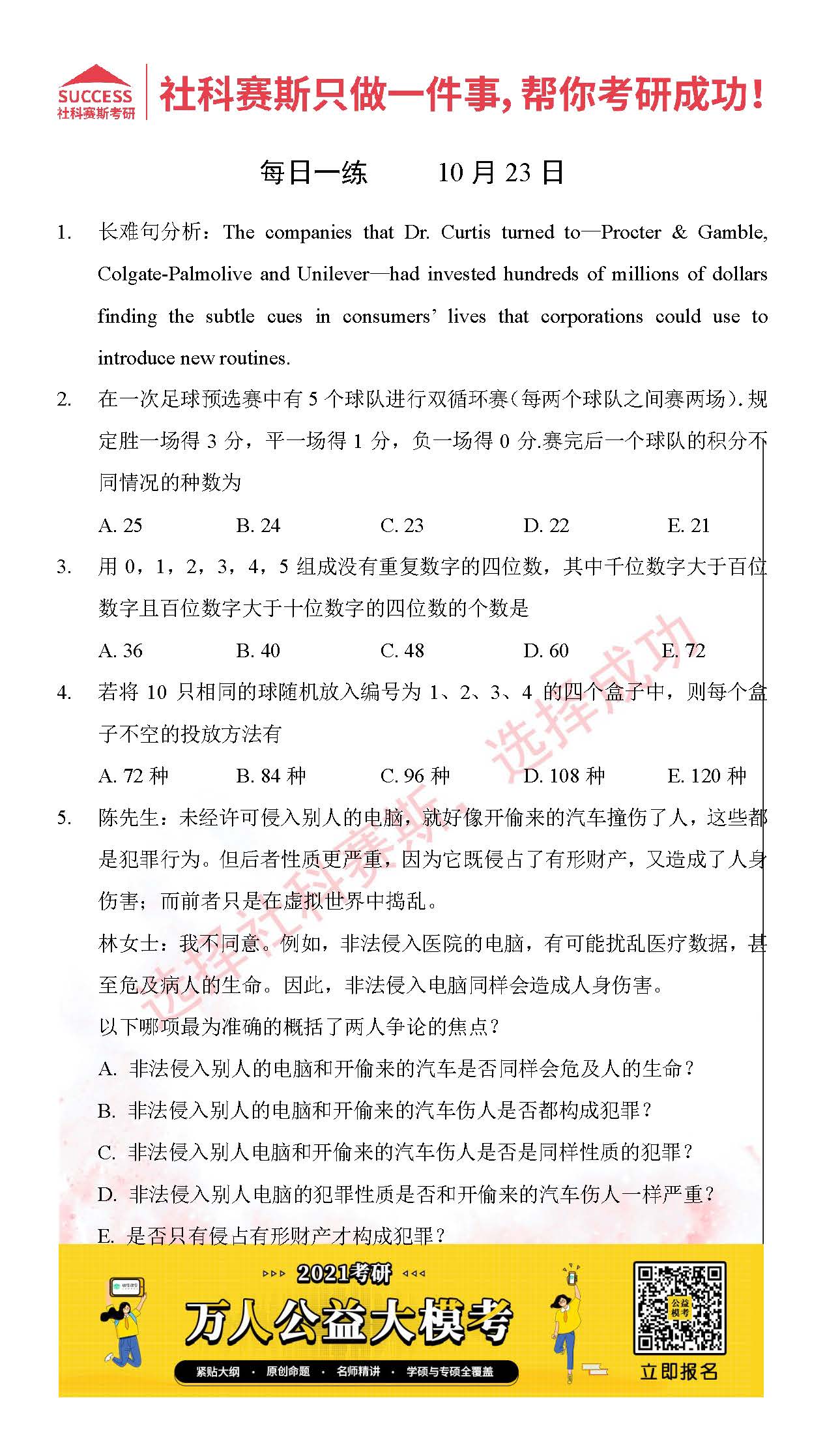 考研是一場持久戰(zhàn),保持良好的學(xué)習(xí)習(xí)慣,是能確保復(fù)習(xí)高效的關(guān)鍵。今天社科賽斯MBA備考網(wǎng)小編整理了“2021管理類聯(lián)10月23日每日一練及答案”的內(nèi)容,希望能對廣大考生有所幫助。