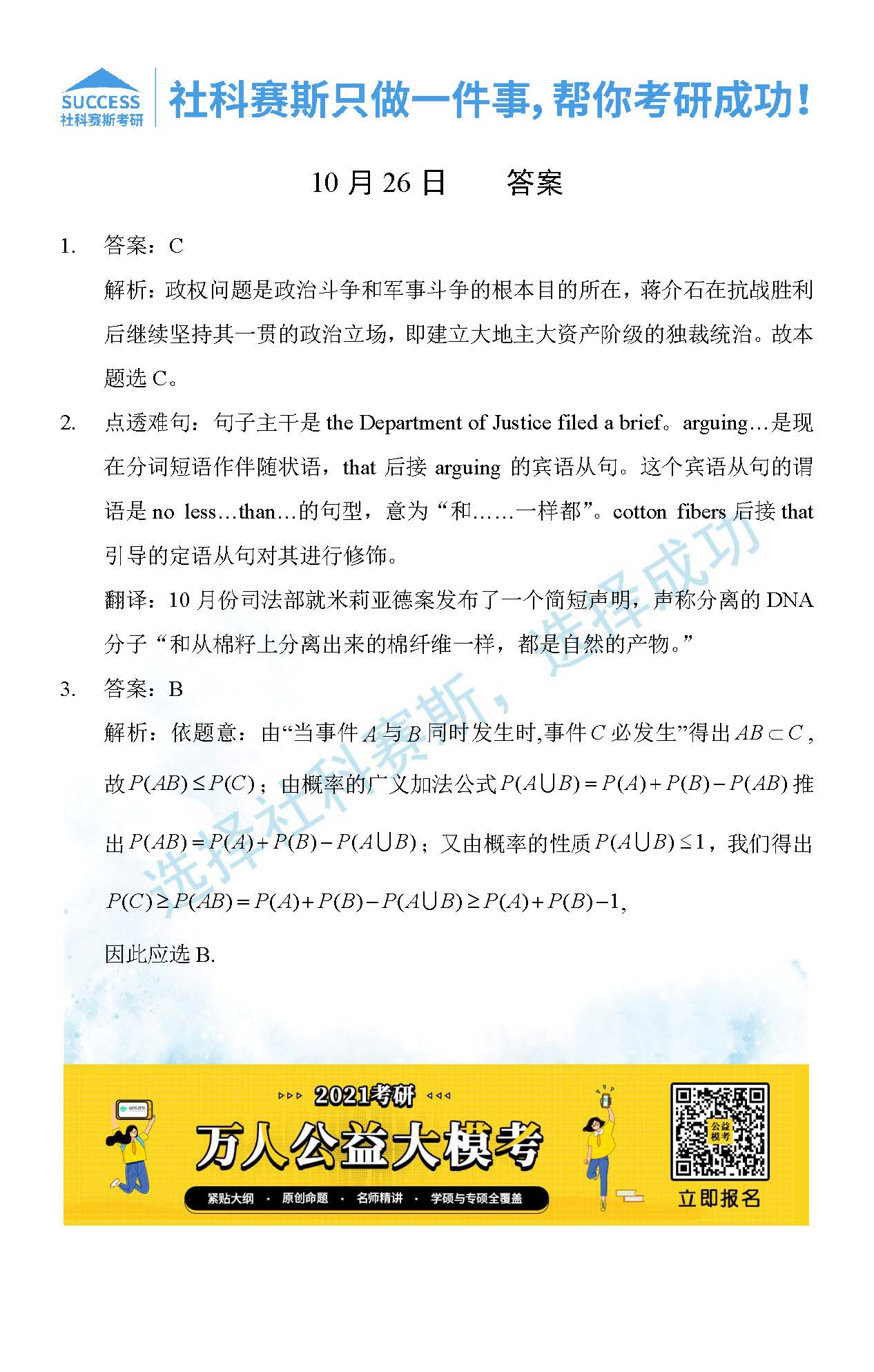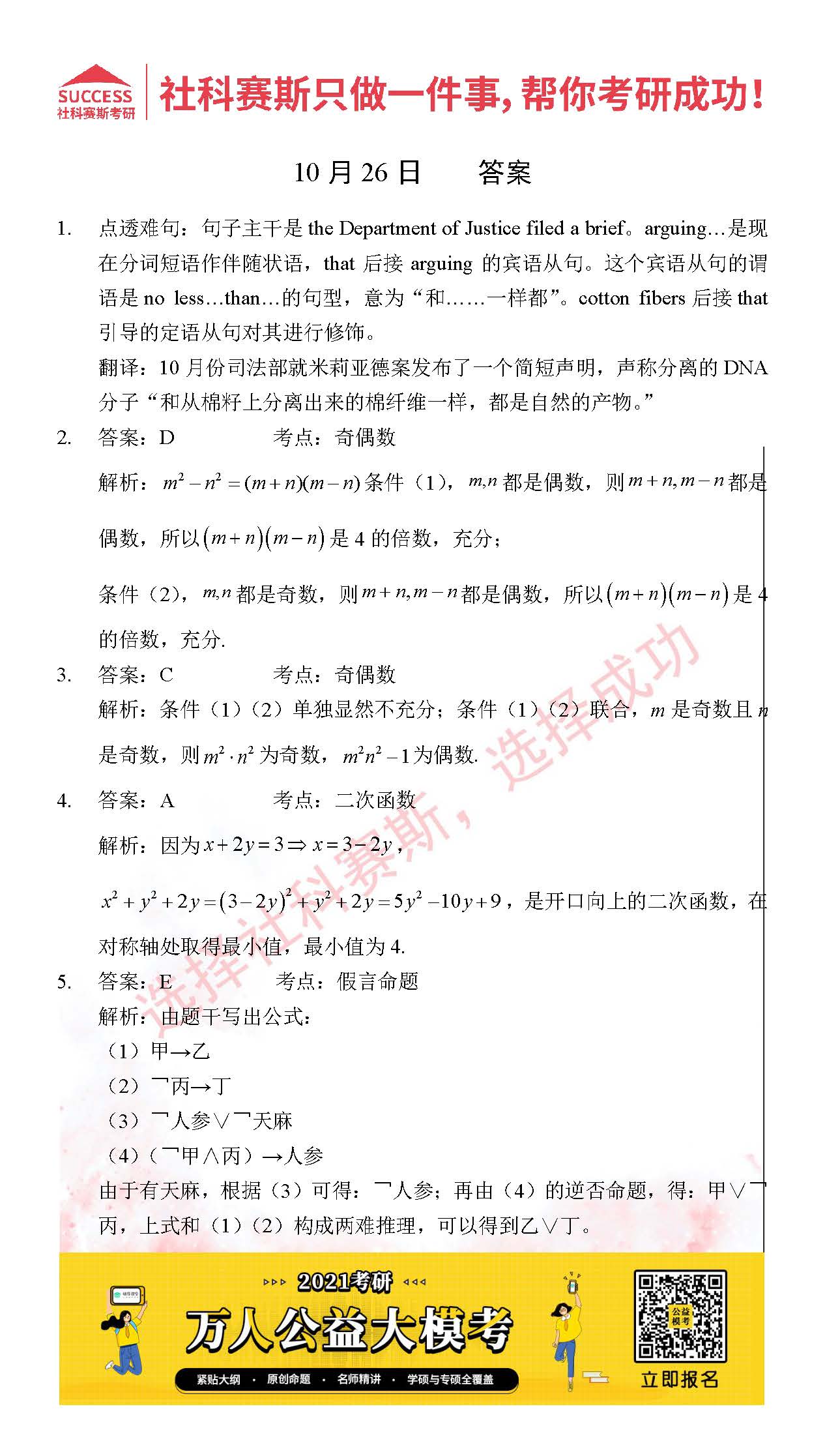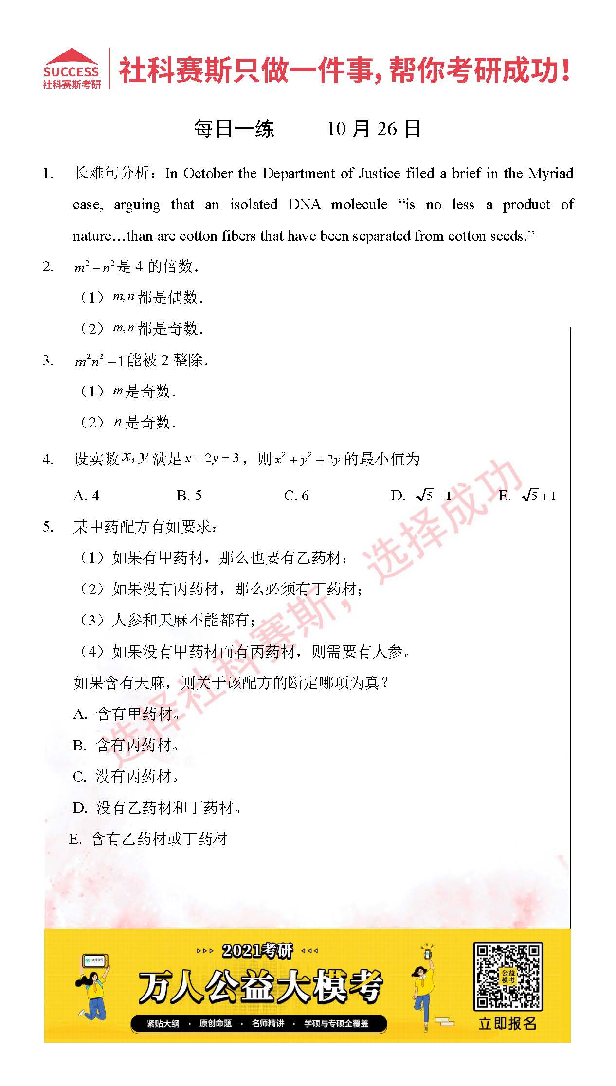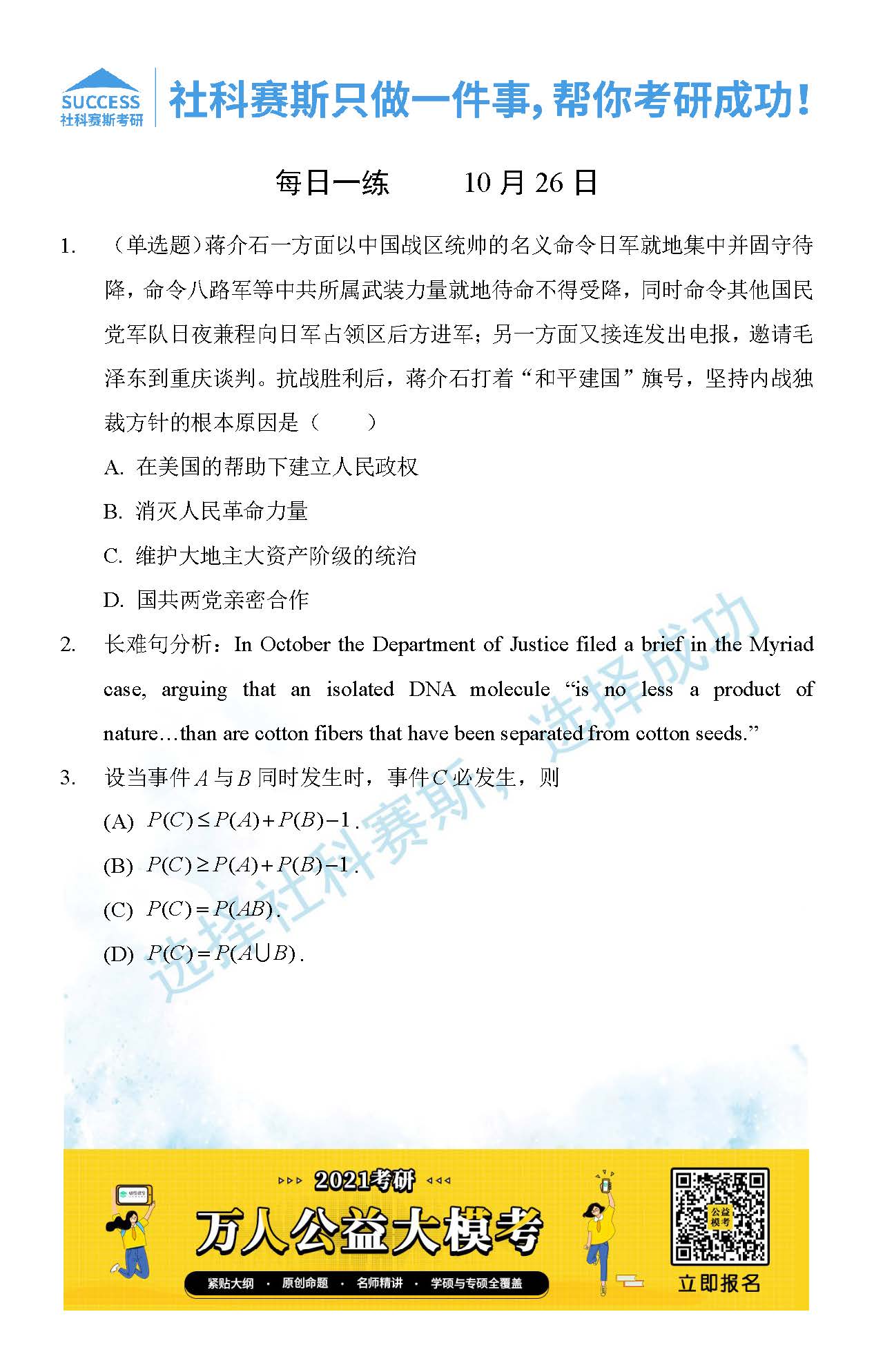 考研是一場持久戰,保持良好的學習習慣,是能確保復習高效的關鍵。今天社科賽斯MBA備考網小編整理了“2021管理類聯10月26日每日一練及答案”的內容,希望能對廣大考生有所幫助。