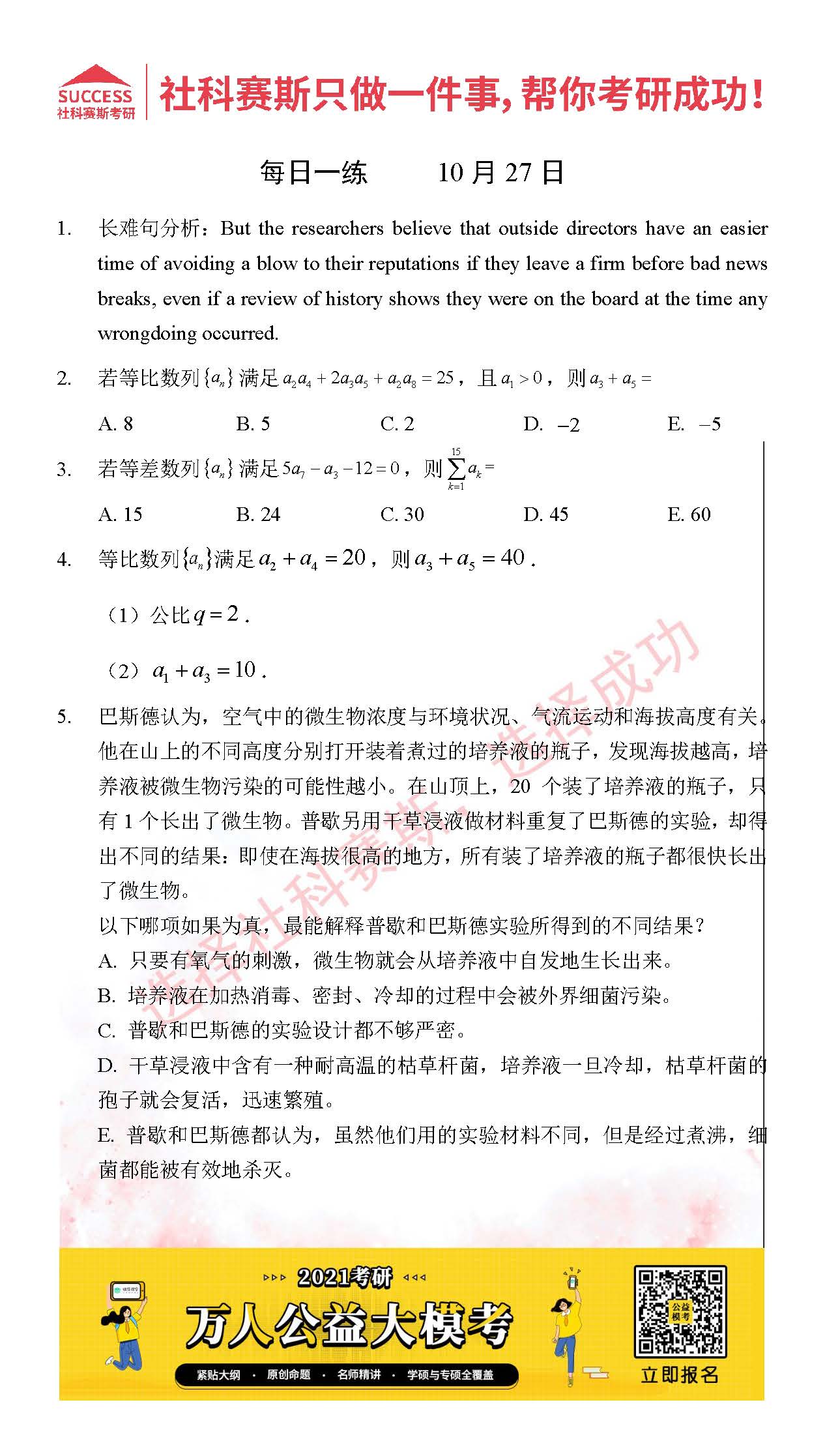 考研是一場持久戰,保持良好的學習習慣,是能確保復習高效的關鍵。今天社科賽斯MBA備考網小編整理了“2021管理類聯10月27日每日一練及答案”的內容,希望能對廣大考生有所幫助。