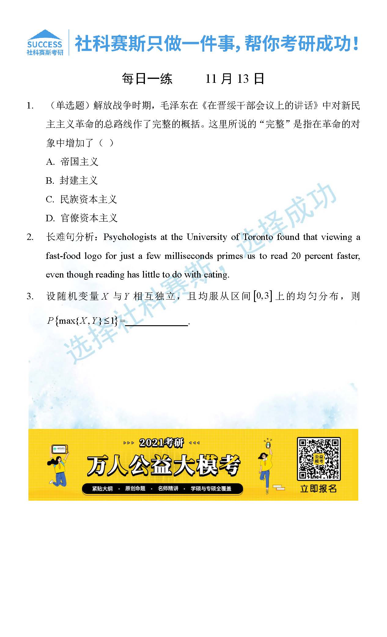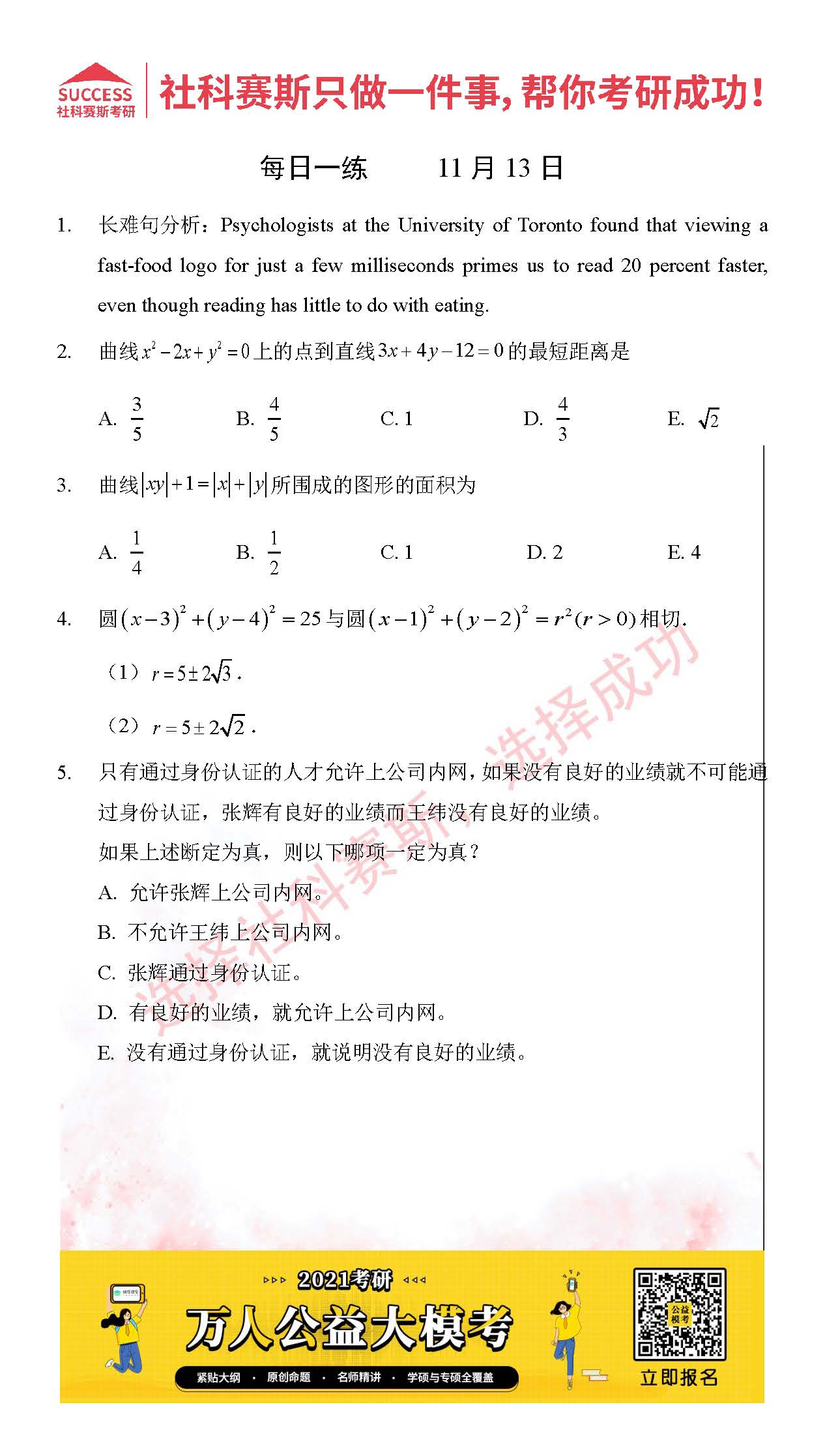 考研是一場持久戰,保持良好的學習習慣,是能確保復習高效的關鍵。今天社科賽斯MBA備考網小編整理了“2021管理類聯11月13日每日一練及答案”的內容,希望能對廣大考生有所幫助。