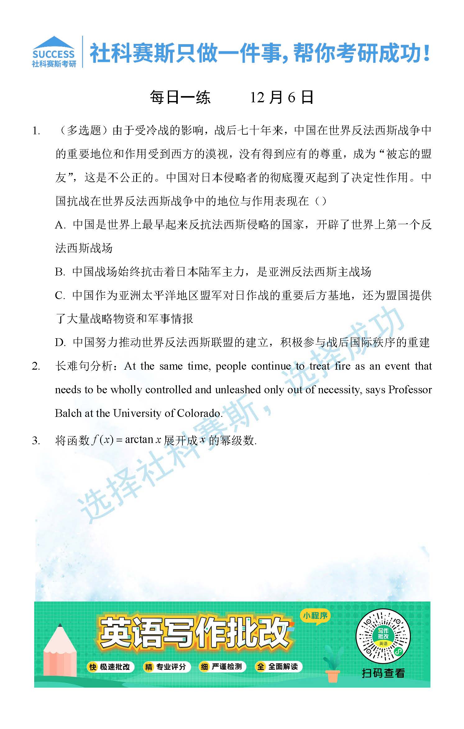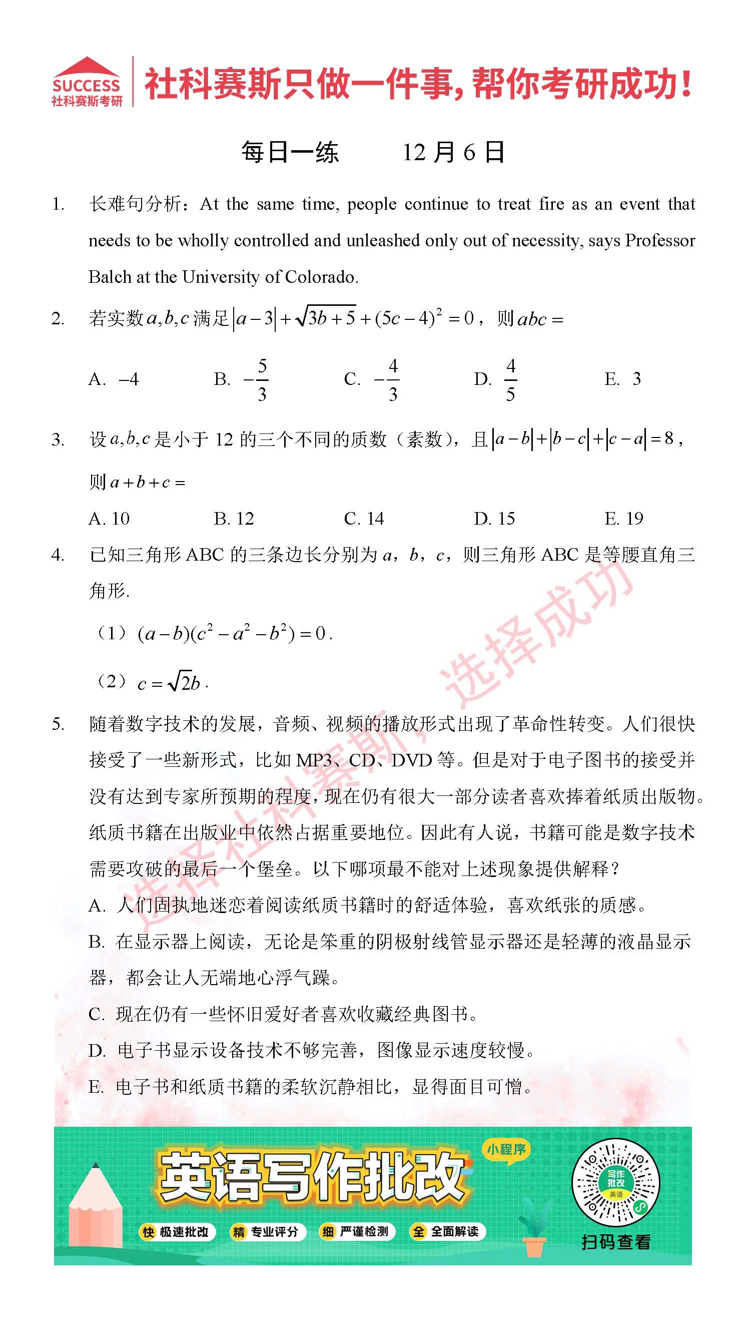 導(dǎo)讀:考研是一場持久戰(zhàn),保持良好的學(xué)習(xí)習(xí)慣,是能確保復(fù)習(xí)高效的關(guān)鍵。今天社科賽斯MBA備考網(wǎng)小編整理了“2021管理類聯(lián)12月6日每日一練及答案”的內(nèi)容,希望能對廣大考生有所幫助。